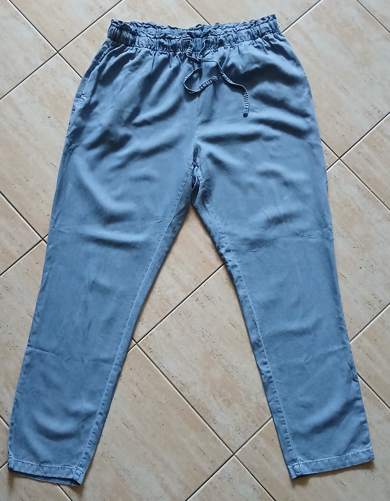 Modré nohavice majú po bokoch vačky, elastickú gumu a šnúrku v páse. Zloženie je lyocel.