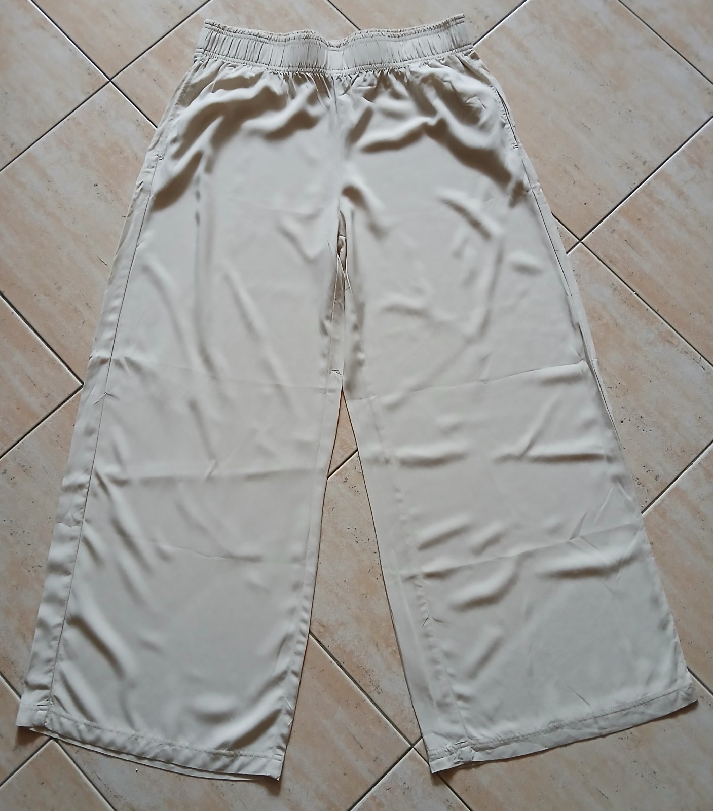 Béžové nohavice sú široké, majú po bokoch vačky a v páse elastickú gumu. Zloženie je 100% viskóza.
