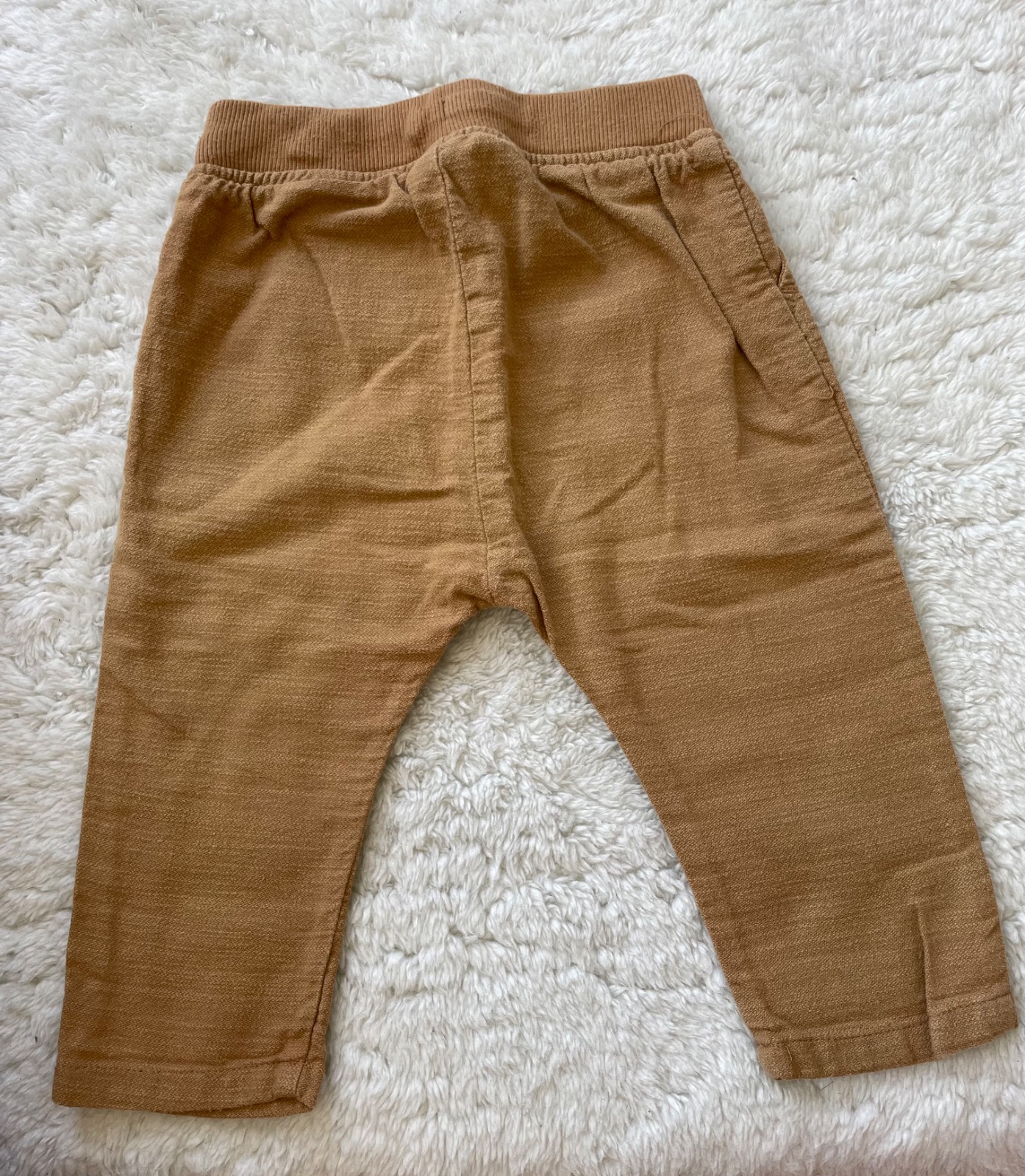 Tenke bledohnede nohavice na gumu v pase, falosne vrecka, uz neviem ci tam bola snurka, malo nosene, neposkodene, farba trosku bledsia v skutocnosti