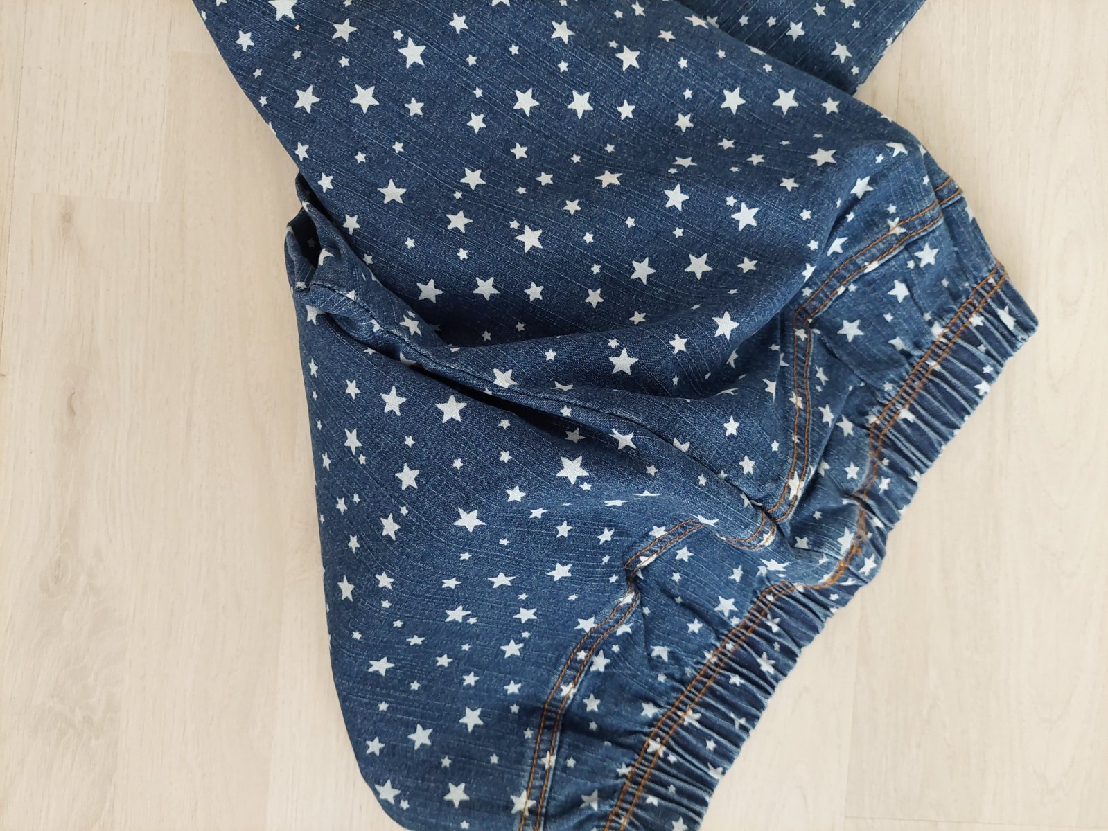 Kuepne v Kik,minimum nosene,bez poskodenia.Dlzka je 95cm,od rozkroku 72cm,pas 35cm.Na kolenach maju ozdobne presivanie a na spodkoch zips.