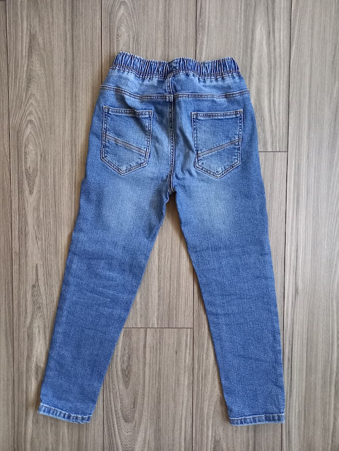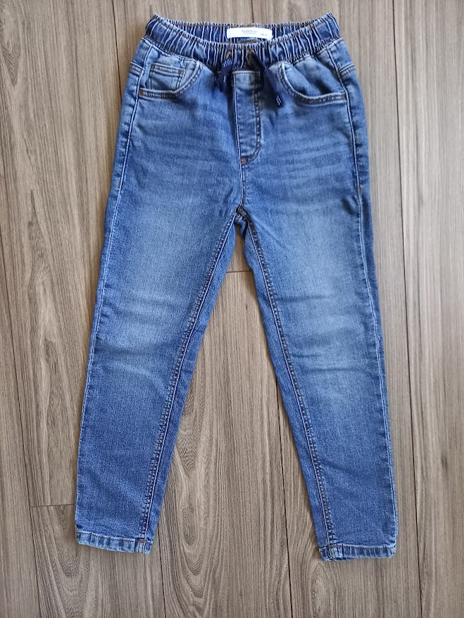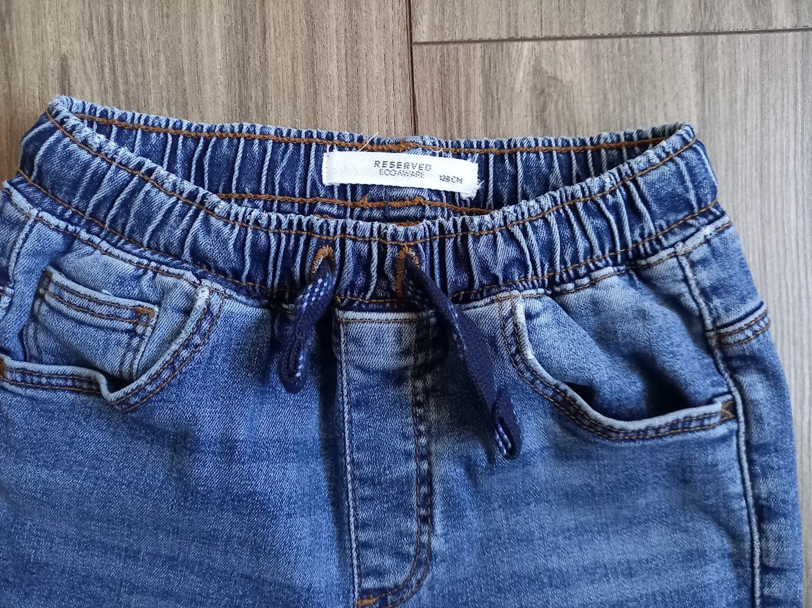 Kvalitné rifle zn. Reserved v top stave. Píšu veľkosť 128 cm. Celková dĺžka 75 cm, dĺžka od rozkroku nadol 53 cm. Vpredu aj vzadu funkčné vrecká. V páse široká guma na regulovanie so šnúrkou. Cena 5 €+3 € poštovné ako balík na poštu.