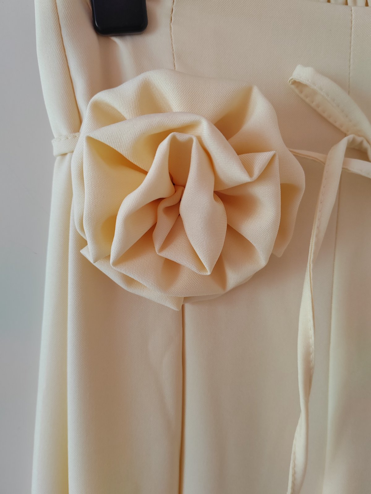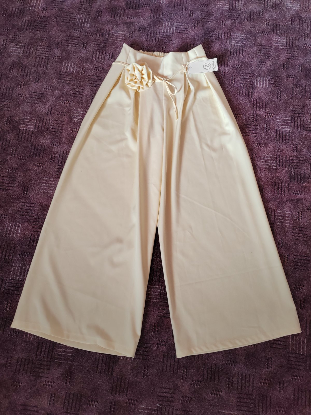 Krásne elegantné nohavice, z príjemného materiálu. Moderný široký strih, v páse na gumu sadnú od Sdo L, menšieho XL. Ruža sa dá odopnúť (brošňa). V páse 2x40cm v kľude, po natiahnutí do 2x45cm.