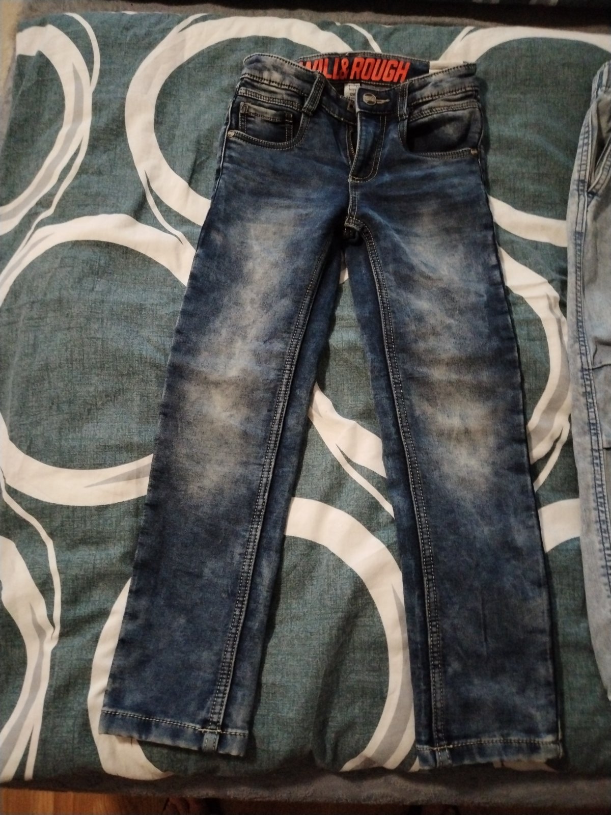 All vor kids rifle pudloveho strihu.Par krat oblecene.Su ako nove.velkost 128/134 .Dlzka 77.5cm....pas v klude 29×2.Este sa natiahnu v pase je guma.makka riflovina..