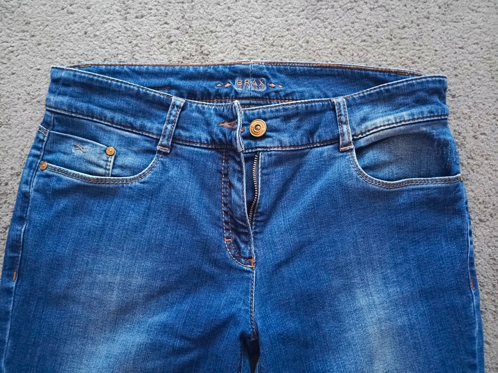 Perfektné džíny tmavomodrej farby mierne rozšíreného strihu v top stave prešívané kontrastnou oranžovou niťou šírka 45cm x2 dlžka 104 cm