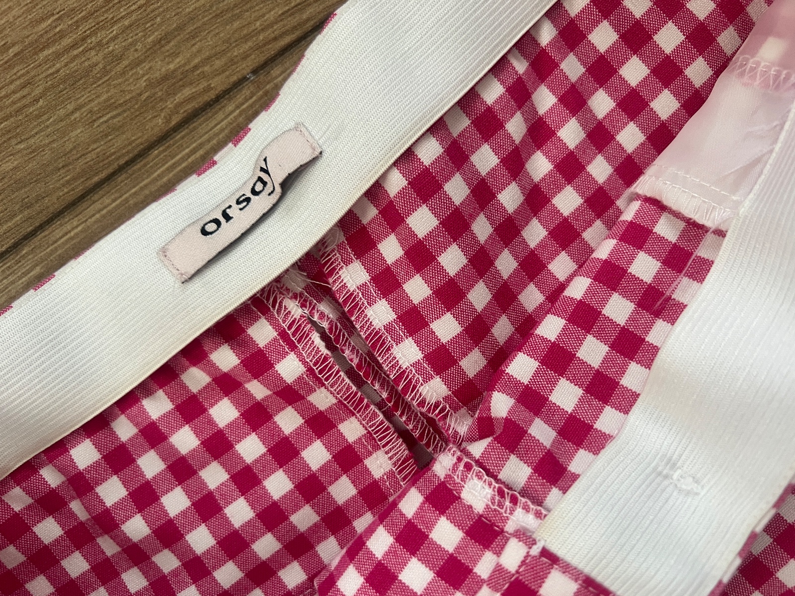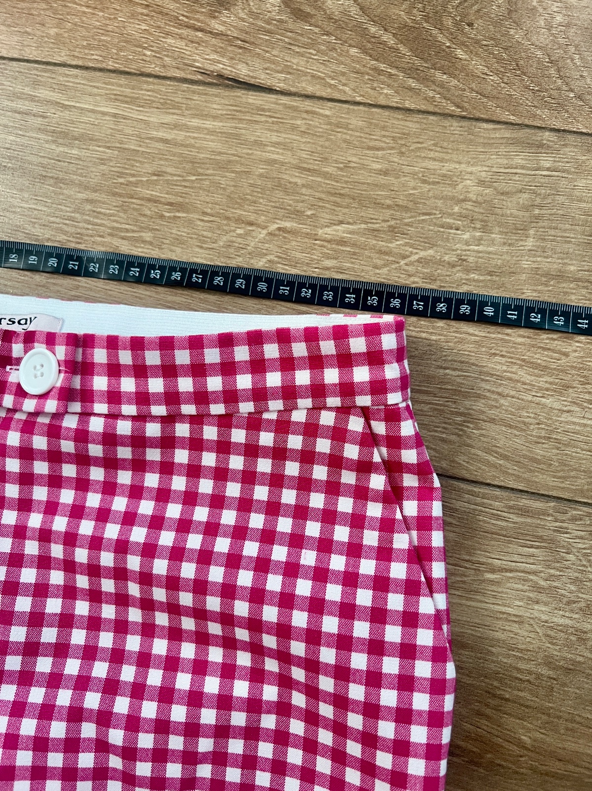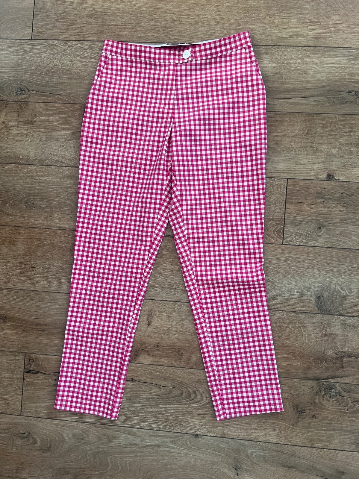 Info z pohlu: Romantické růžovo-bílé kostičkované bavlněné kalhoty se skrytými kapsami, knoflíkem, zipem a gumou v pase. Nohavice se lehce zužují. Prodyšný materiál a volnější střih umožní pohodlí při nošení.