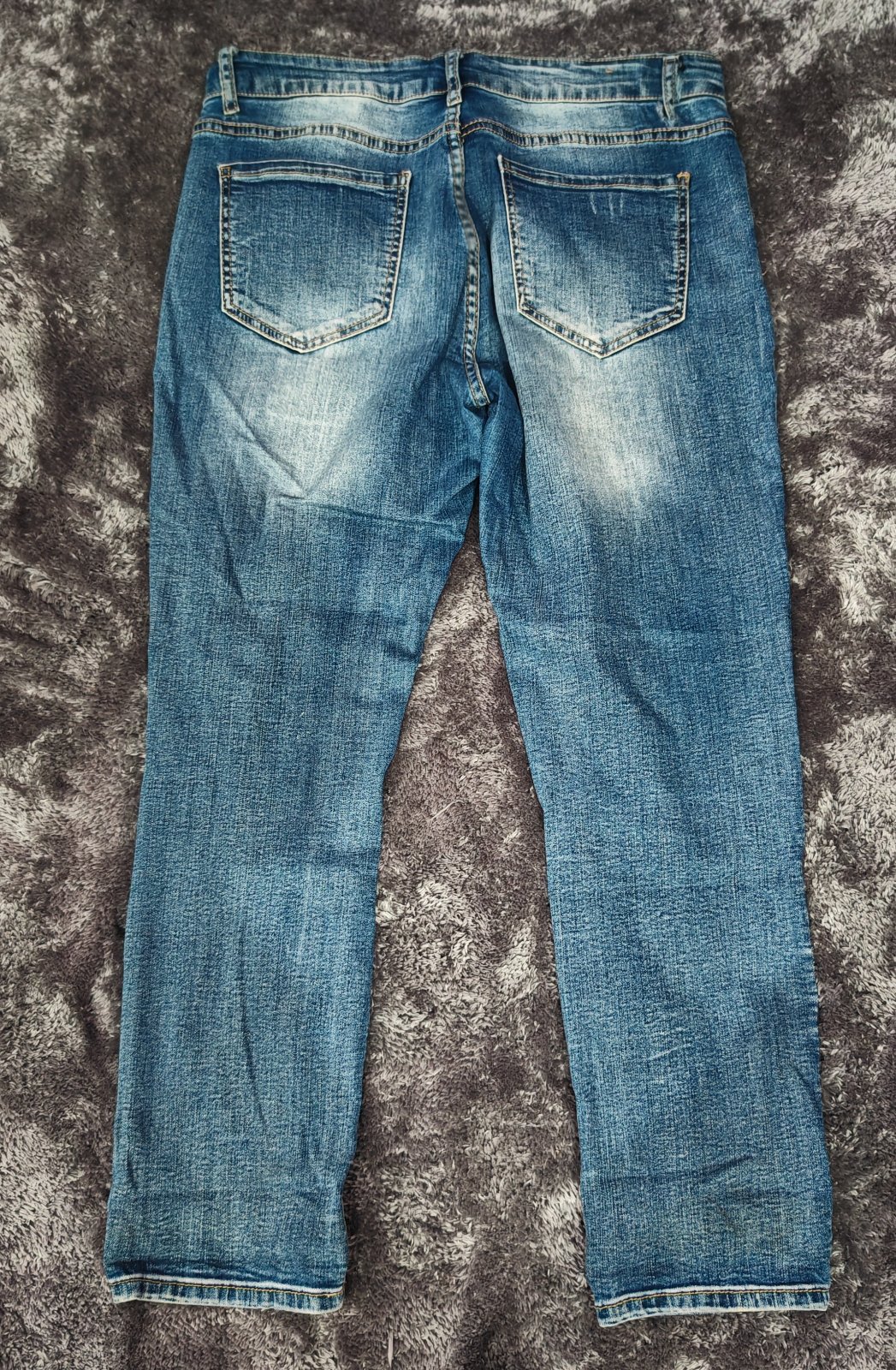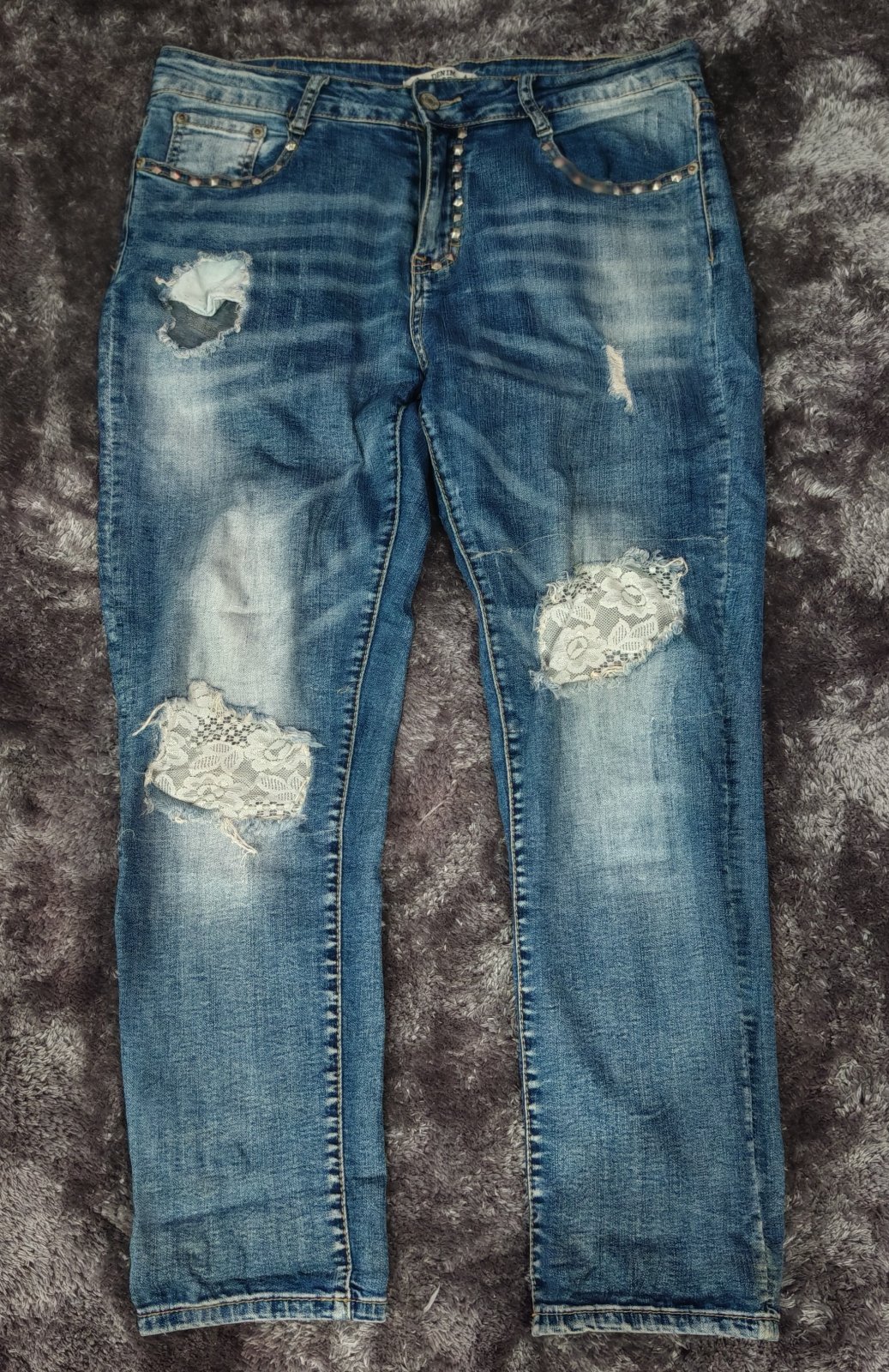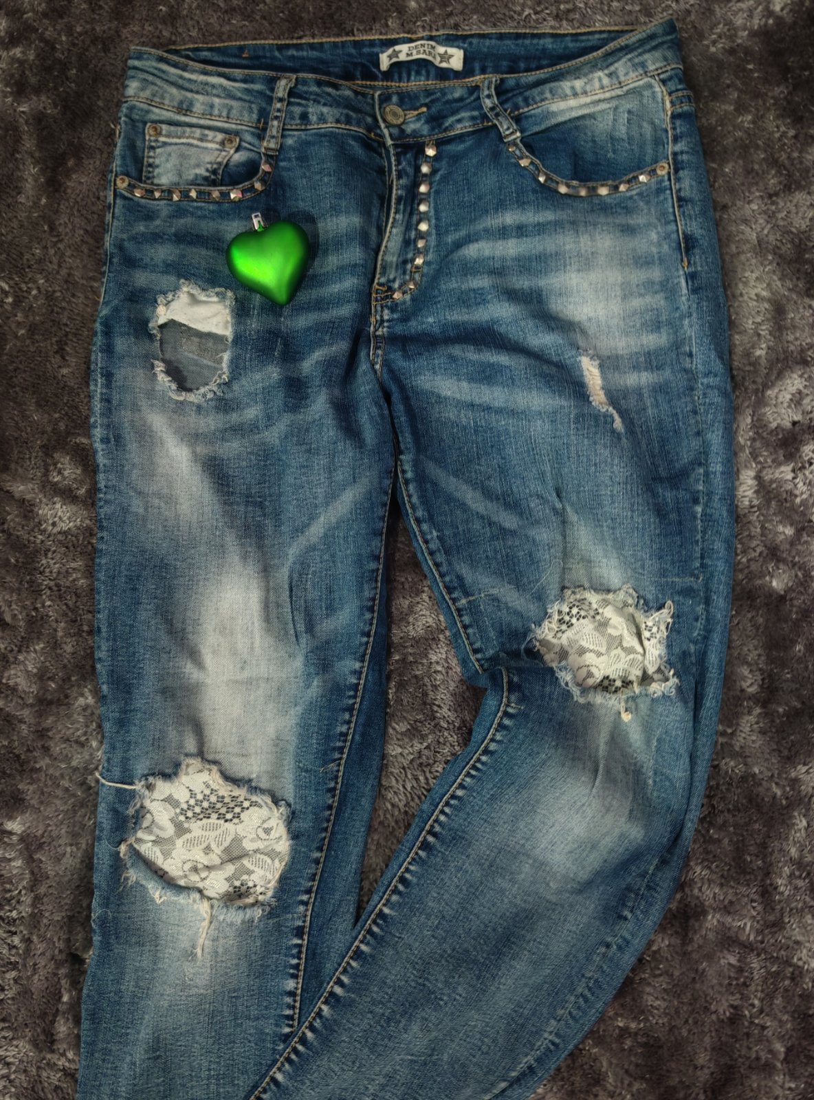 Modre,makke,pruzne rifliky,ozdobne kovanie,suchane,trhane,nosene,oblubene,maju odtrhnute putko-zasijem,zips sa odopina-da sa zachytit o gombik tenkou gumickou :-),este potesia.Su zdarma k objednavke alebo za 2e,velkostne od L vyssie,pri zaujme pomeriam