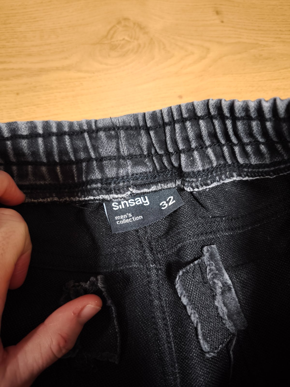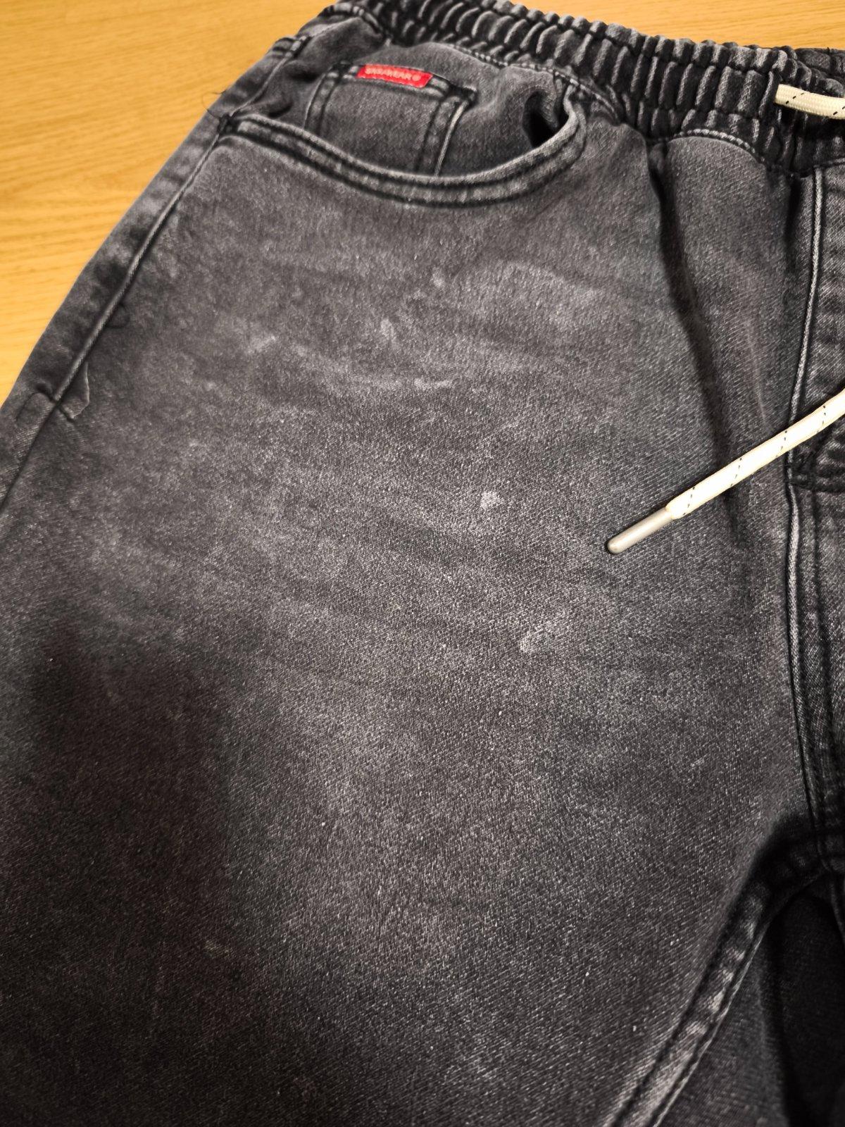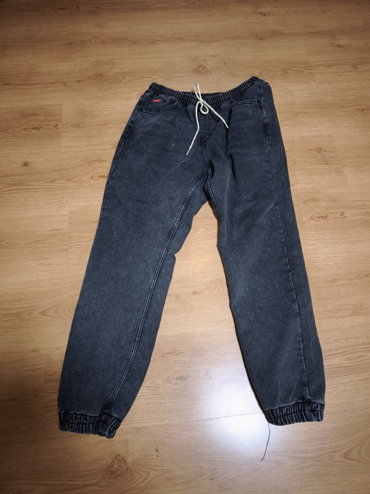 Material hrubší, niečo ako riflovina. Na látke sú falošné frkance.