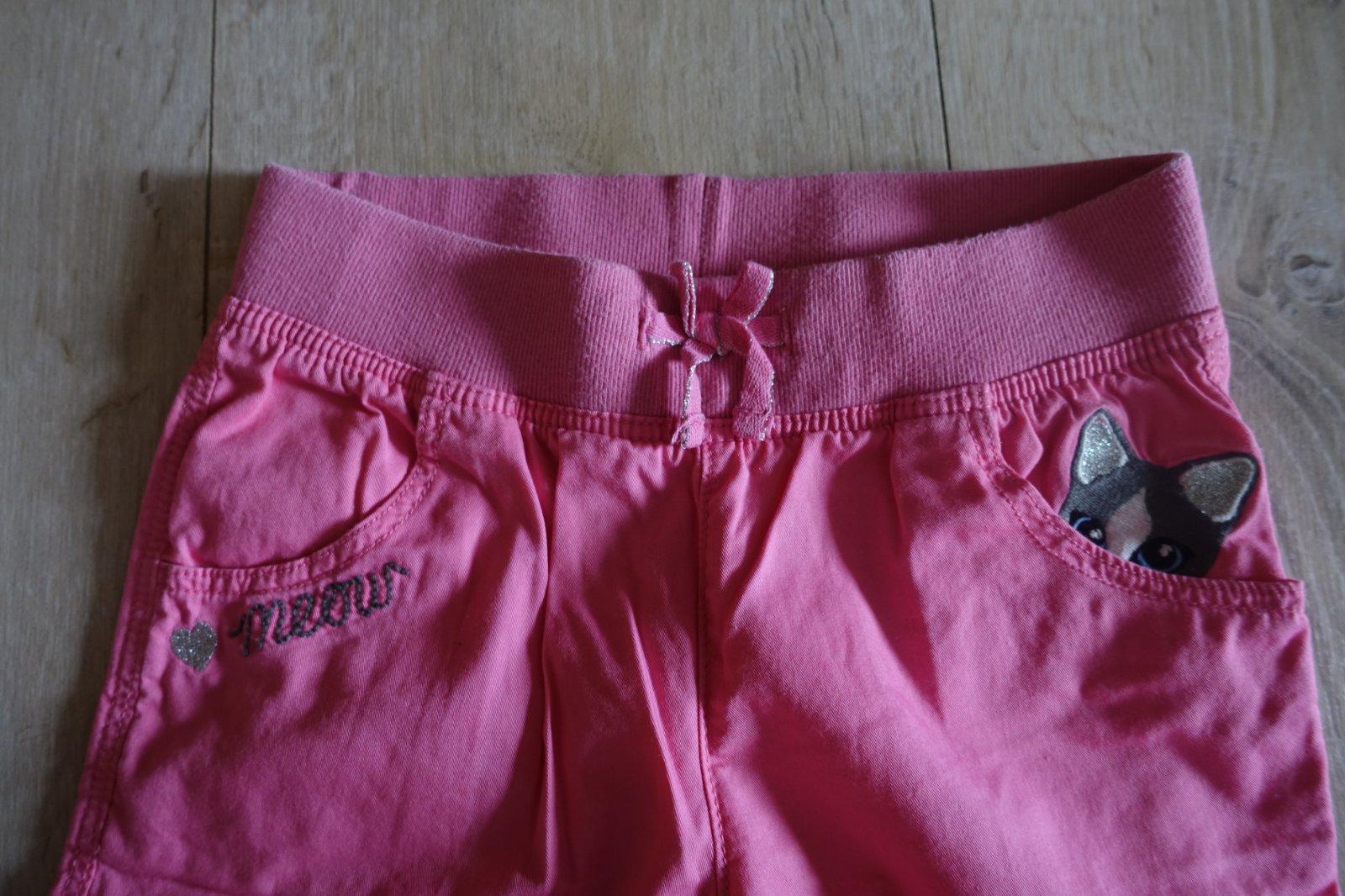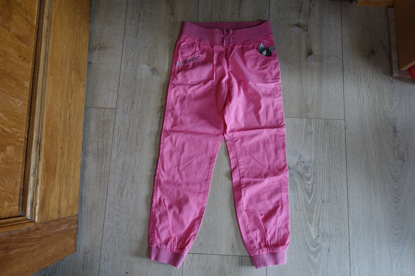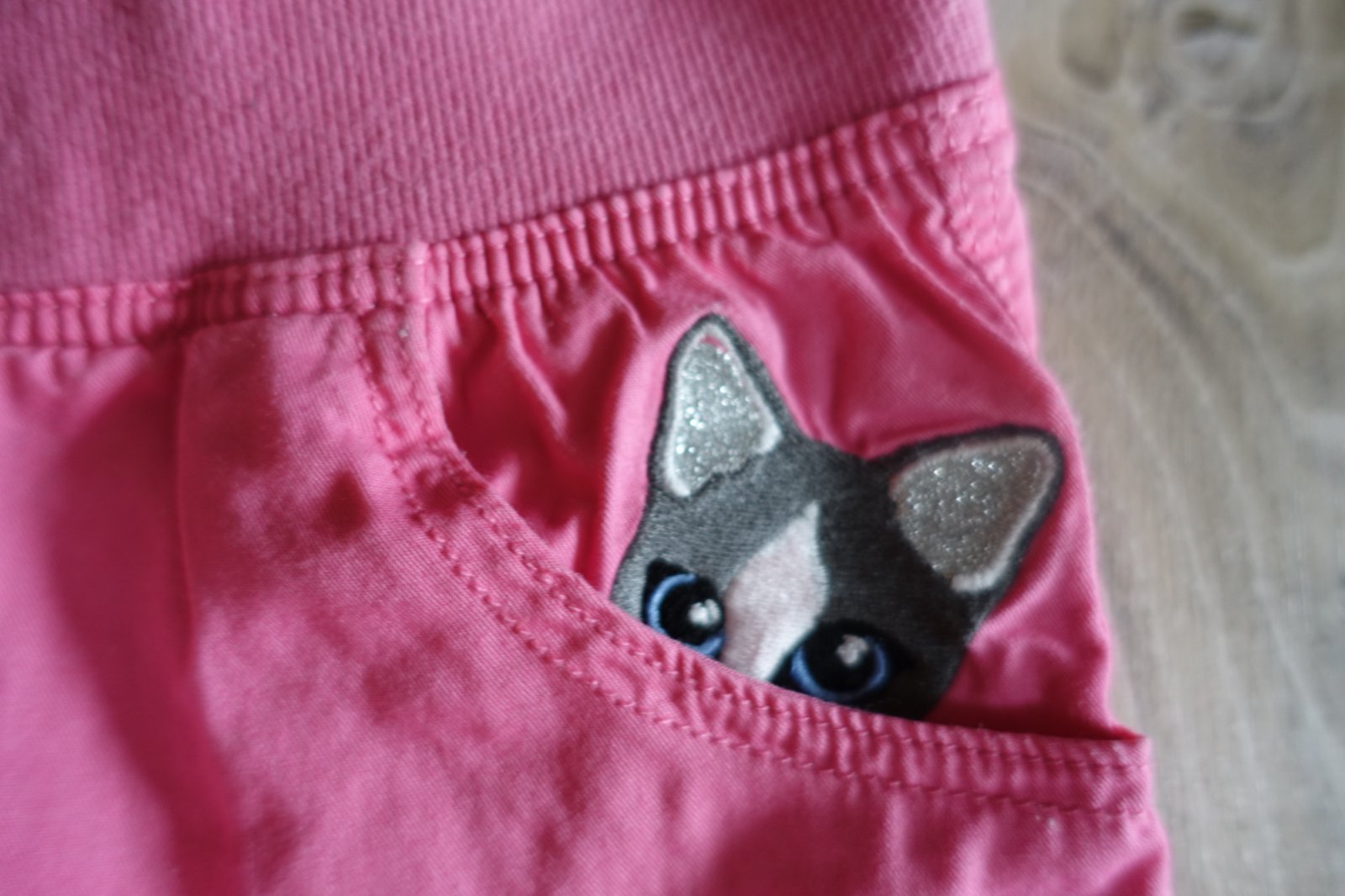 Predám krásne nohavice z H&M - nie sú podšité bavlnou, sú len jednovrstvové. Sú mäkučké, pohodlné, krásne. Mačička má trblietavé strieborné ušká, na opačnom vrecku je strieborné trblietavé srdiečko a aj šnúrka má strieborné trblietavé olemovanie. Boli nosené na striedačku aj s inými, ale sú v peknom nosenom stave. Nosenie troška vidno na patentoch, trošička sa začína tvoriť chĺpoček z prania. Pás je len na gumičky, šnúrky sú len na okrasu, nedajú sa zatiahnuť. Vpredu majú dve vrecká. Celková dĺžka je 79 cm, od rozkroku 56 cm. Dĺžka pása v kľude je 30 cm, ale natiahne sa na 34 cm. (G)