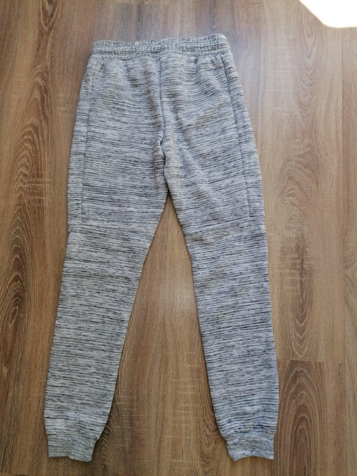 nosené hrubšie bavlnené tepláky, s vreckami, v páse na gumu, značka one by one, veľkosť písaná 164, ale asi menšie, šedá farba, celková dĺžka je 82,5 cm, pás je 2x 35-43 cm, vidieť nosenie, bez poš...