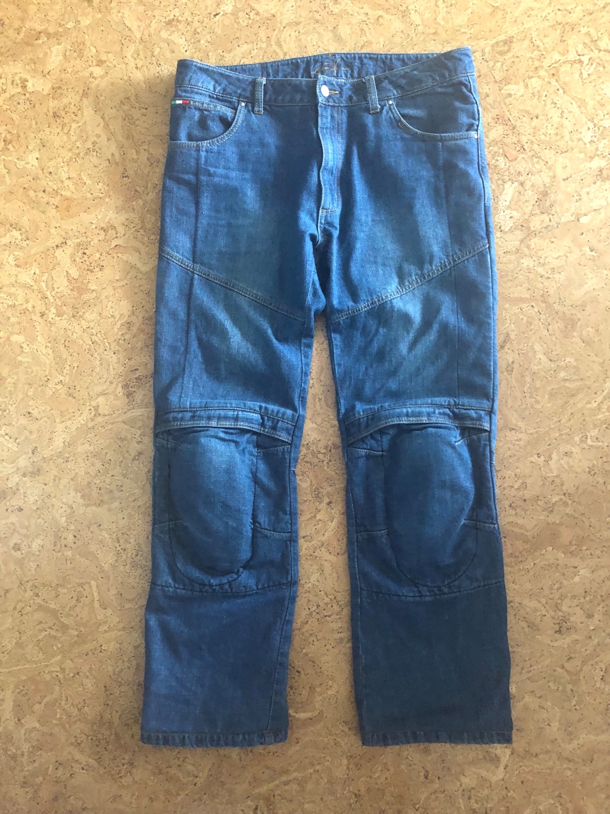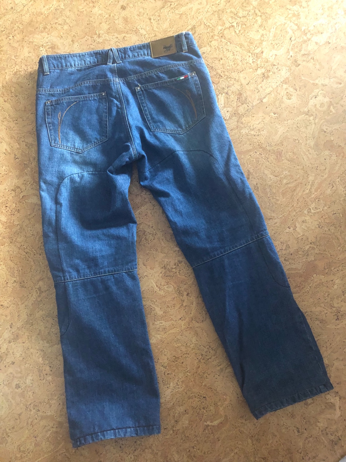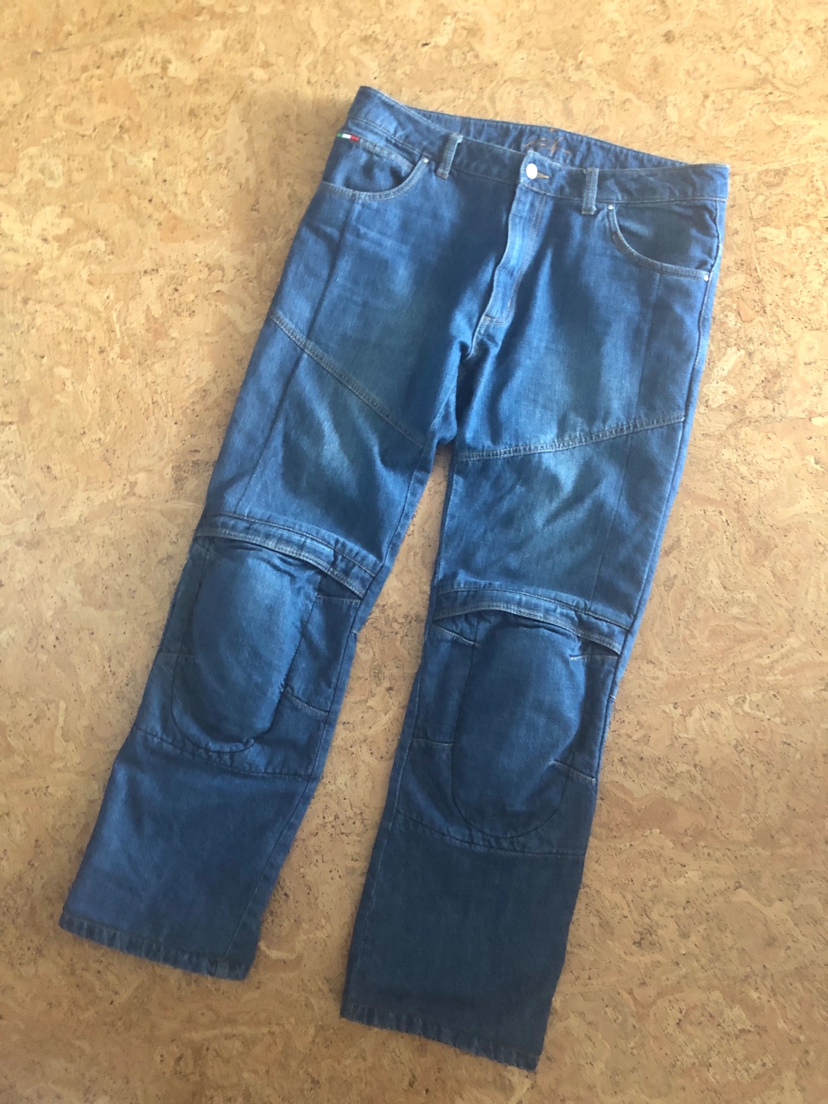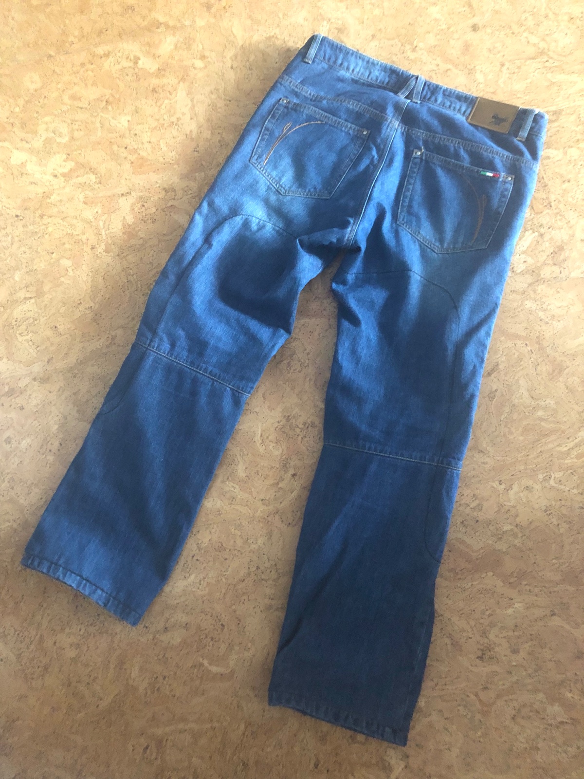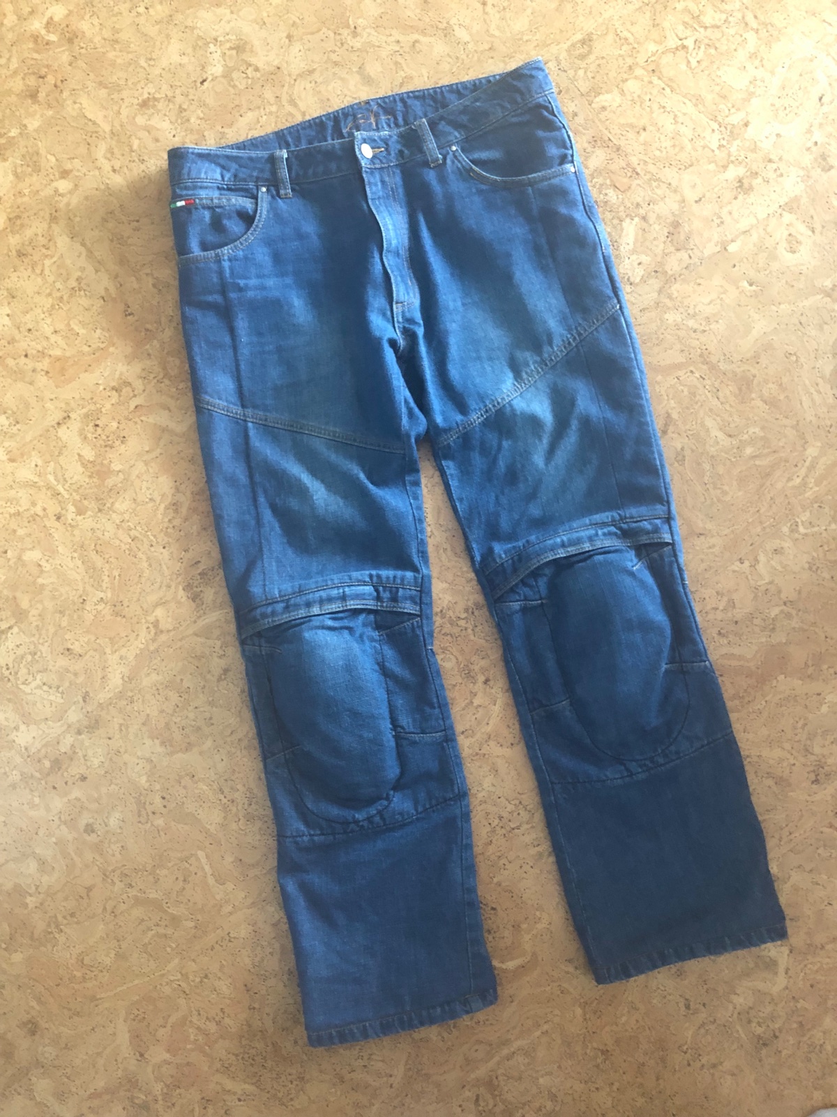 Výborný stav,Unisex,velkost píše 52,sedí na L,pas 48x2,boky 57-58x2, dlz 103cm,chrániče na kolenných,dĺžka bola v krajčírstve skrátená.