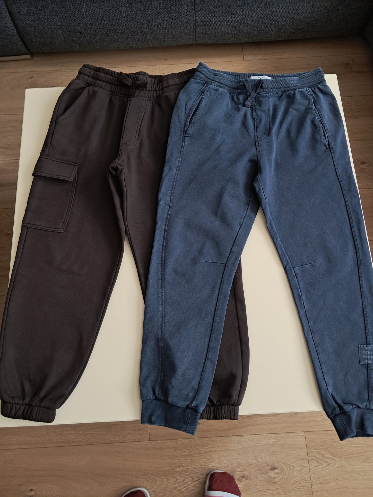 Tmavohnedé teplaky a modre vypratyvefekt obe vo v.152 ale su nositeľne skor vo veku okolo 10,5r tak preto v.146