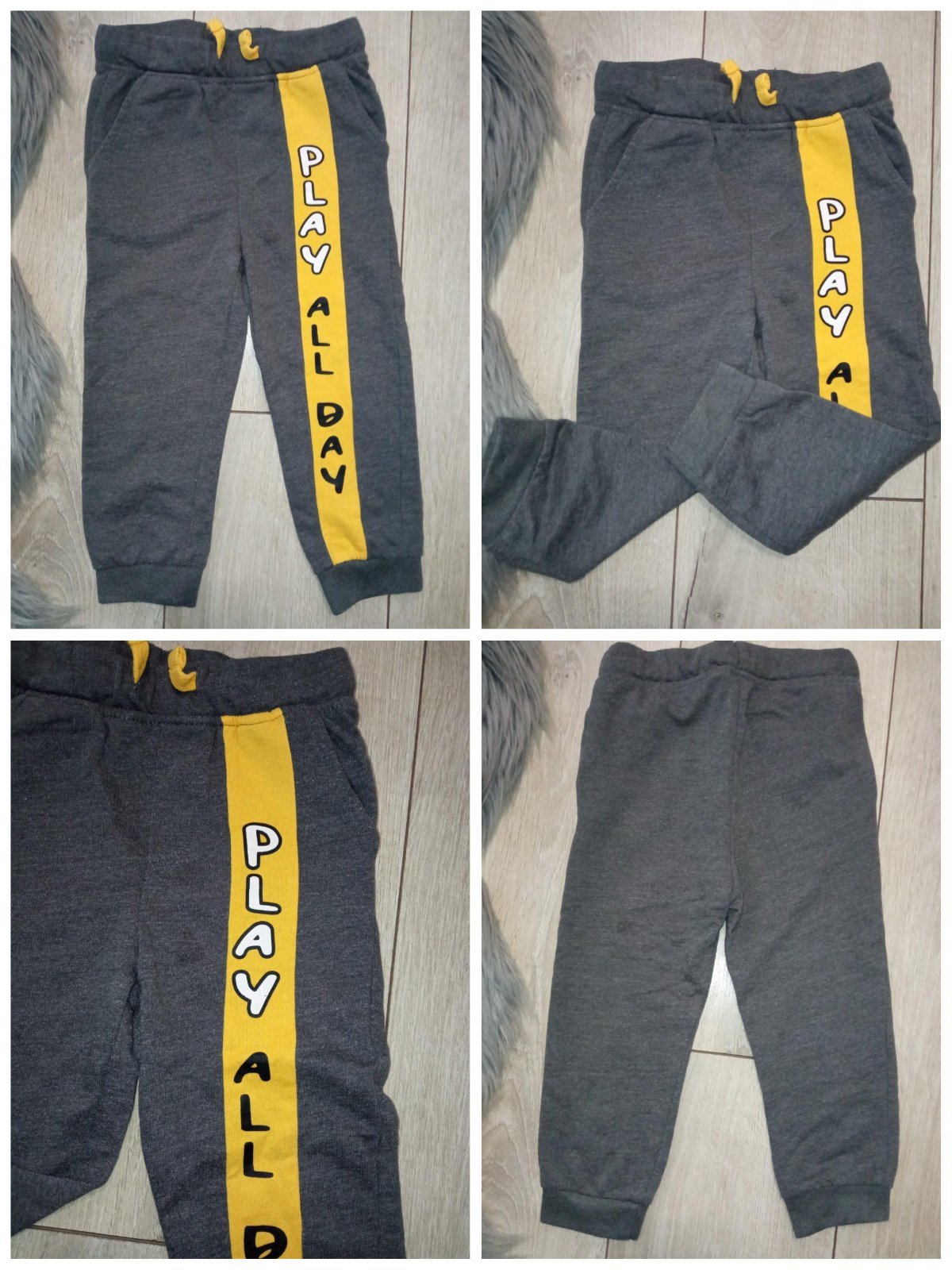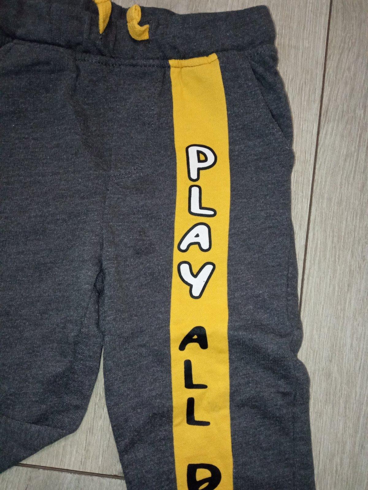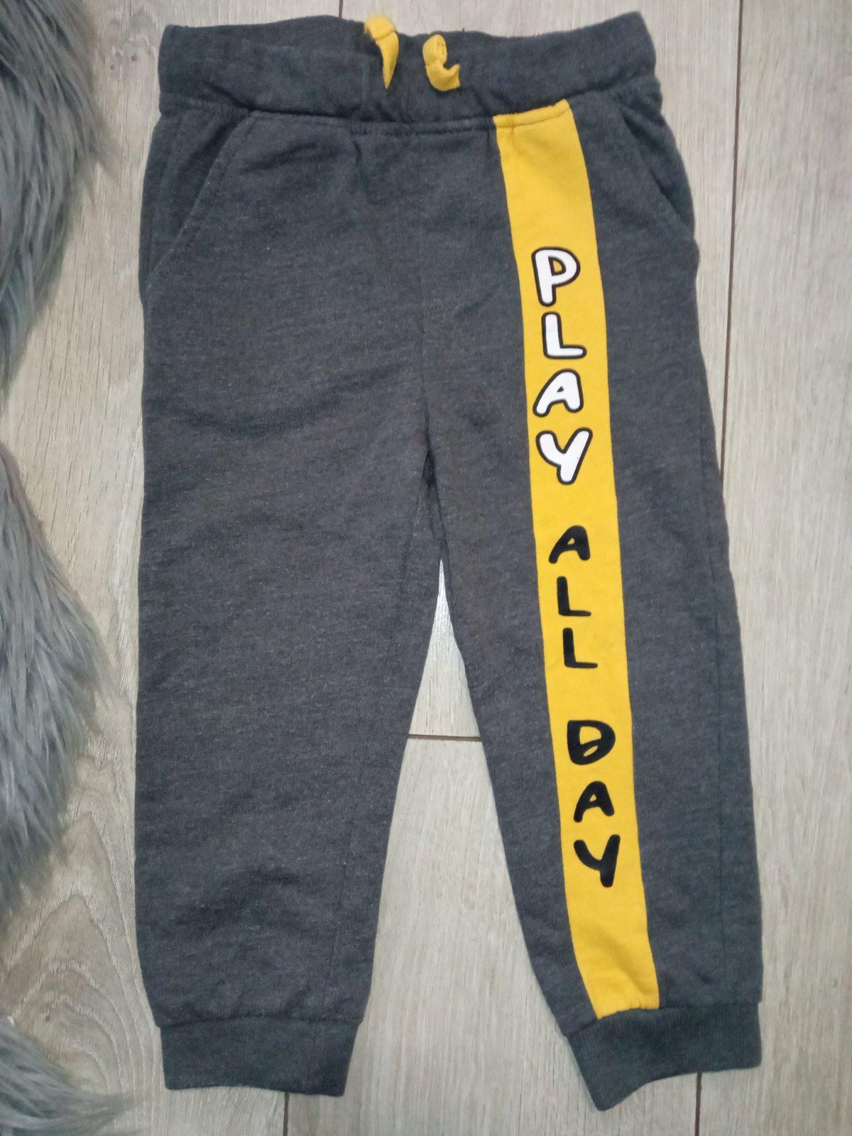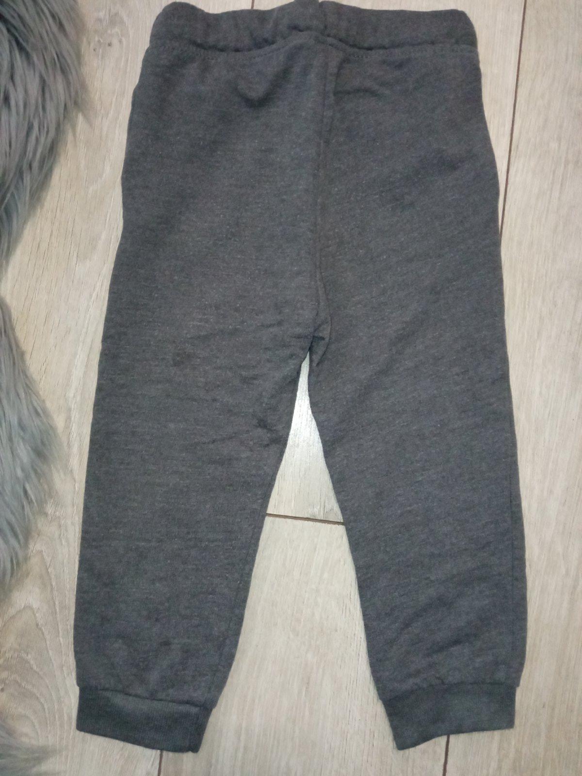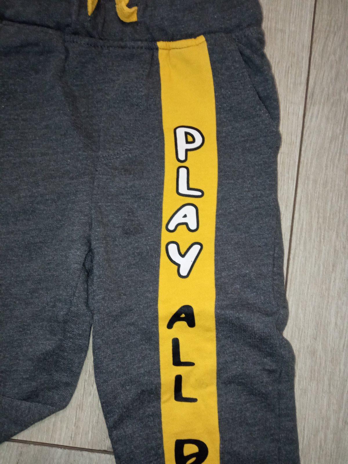 Chlapčenské sivé tepláky, žltý pás s nápisom (maličký fľak), elastické, pás na gumu, zaväzovanie na šnúru, dve bočné vrecká, materiál: 60%bavlna,40%polyester.