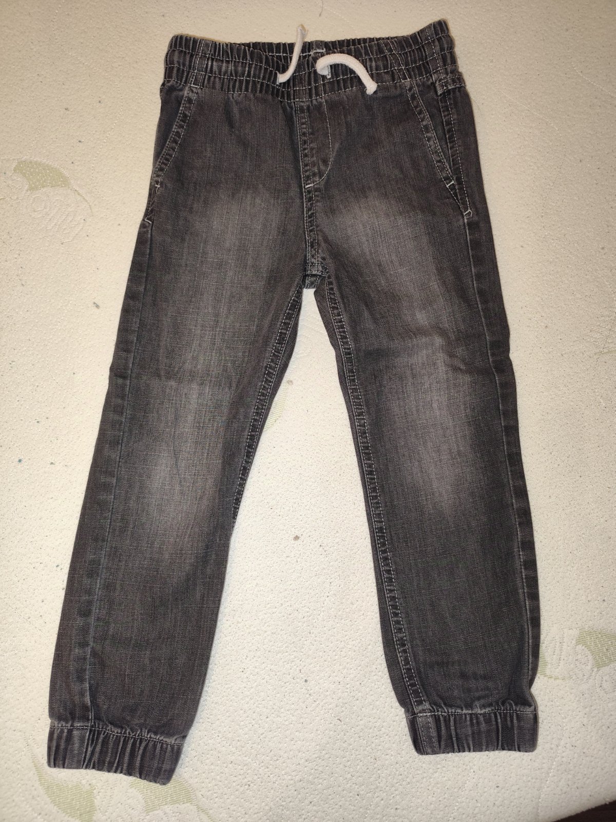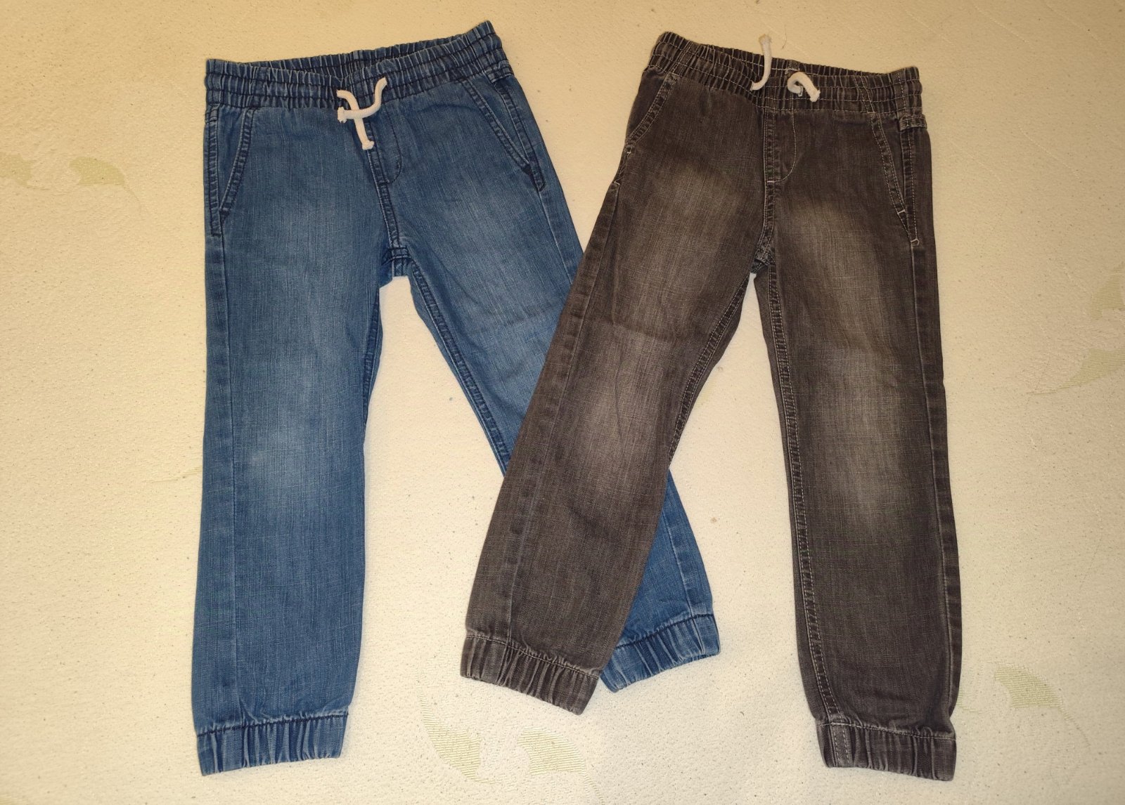 Málinko nosené tenšie čierne a modré rifle značky H&M, veľkosť na štítku uvedená 110 spolu za 6€.