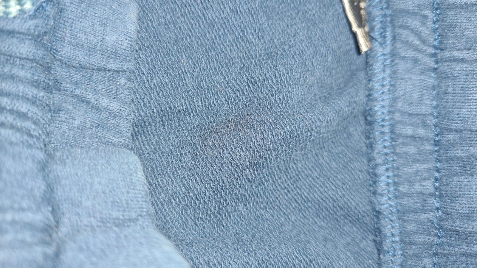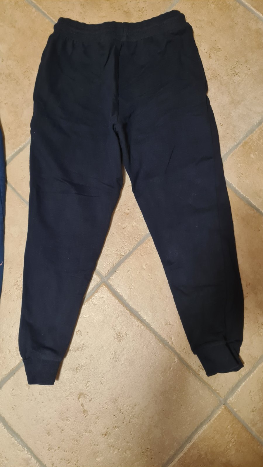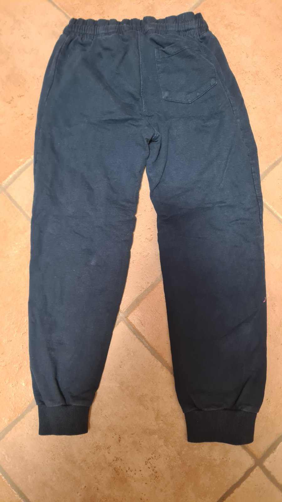 Tie čisto Tmavomodré som hore kúsok vypárala, aby som mohla navliecť gumu, keďže stredný gumičkový tunel je prešitý kvôli vyvliekaniu šnúrky. Nepára sa to ďalej, mám to osvedčené na viacerých teplákoch. Syn nosí triko vonku, takže nám to ani esteticky neprekážalo.