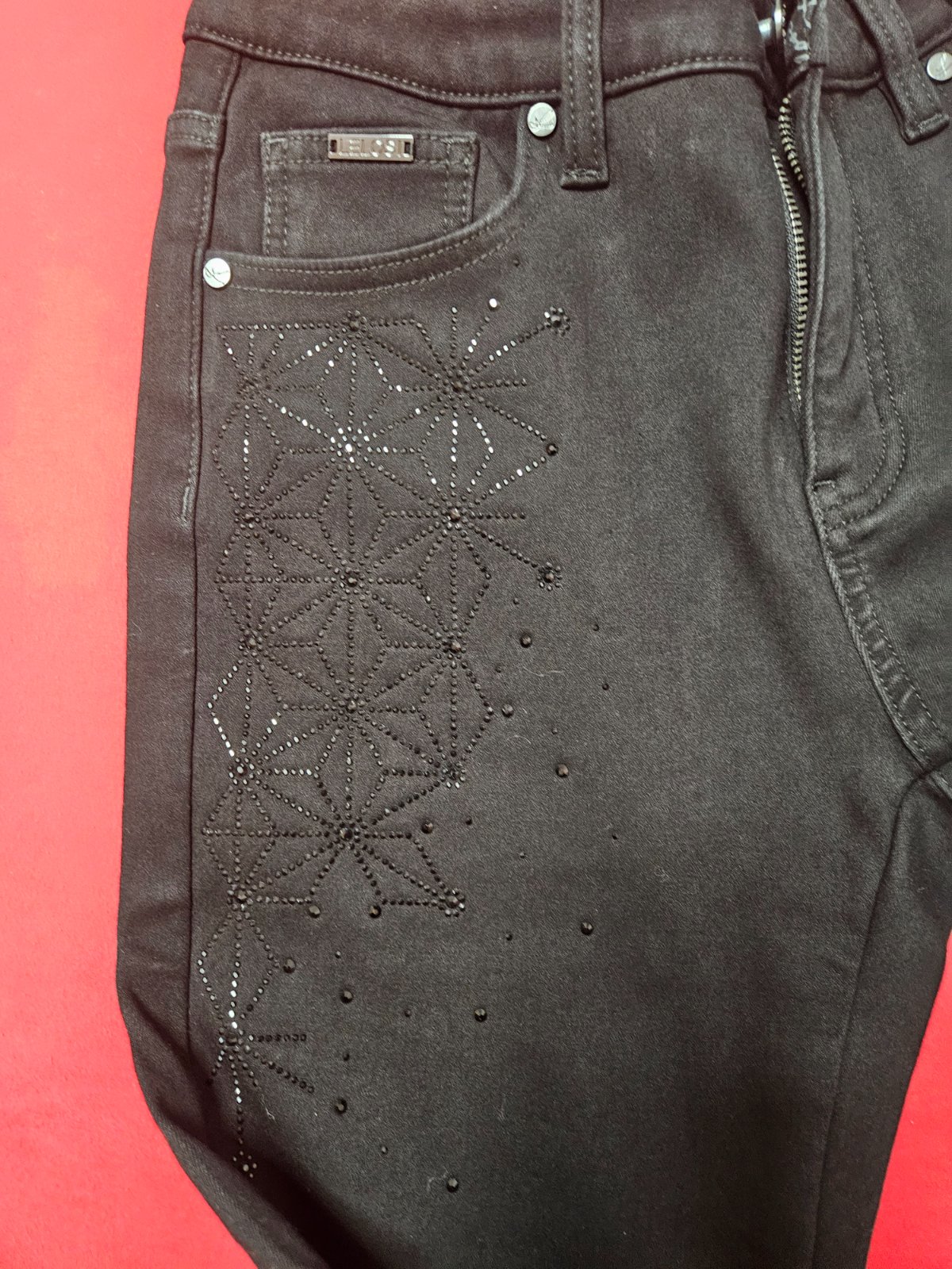 Krasne tenke cierne rifle, trblietave, na fotke to nevidiet, nosila som iba po porode na poradnu, uz su mi velke, makka prijemna riflovina. Velkost pise 33, pas 44,5cm, boky 53cm, dlzka 98cm (boli ...