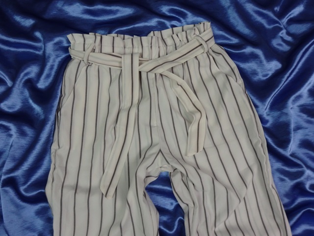 Kvalitné letné nohavice bielej farby, s tmavosivým pásikom, s ružovým nádychom, materiál 100% viskóza, super stav.