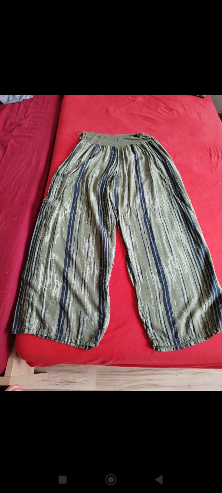Príjemné olivové kapsáče na spodu do gumy. V páse guma a šnúrka. Veľkosť 38. Dĺžka 89 cm a pás 33 cm.