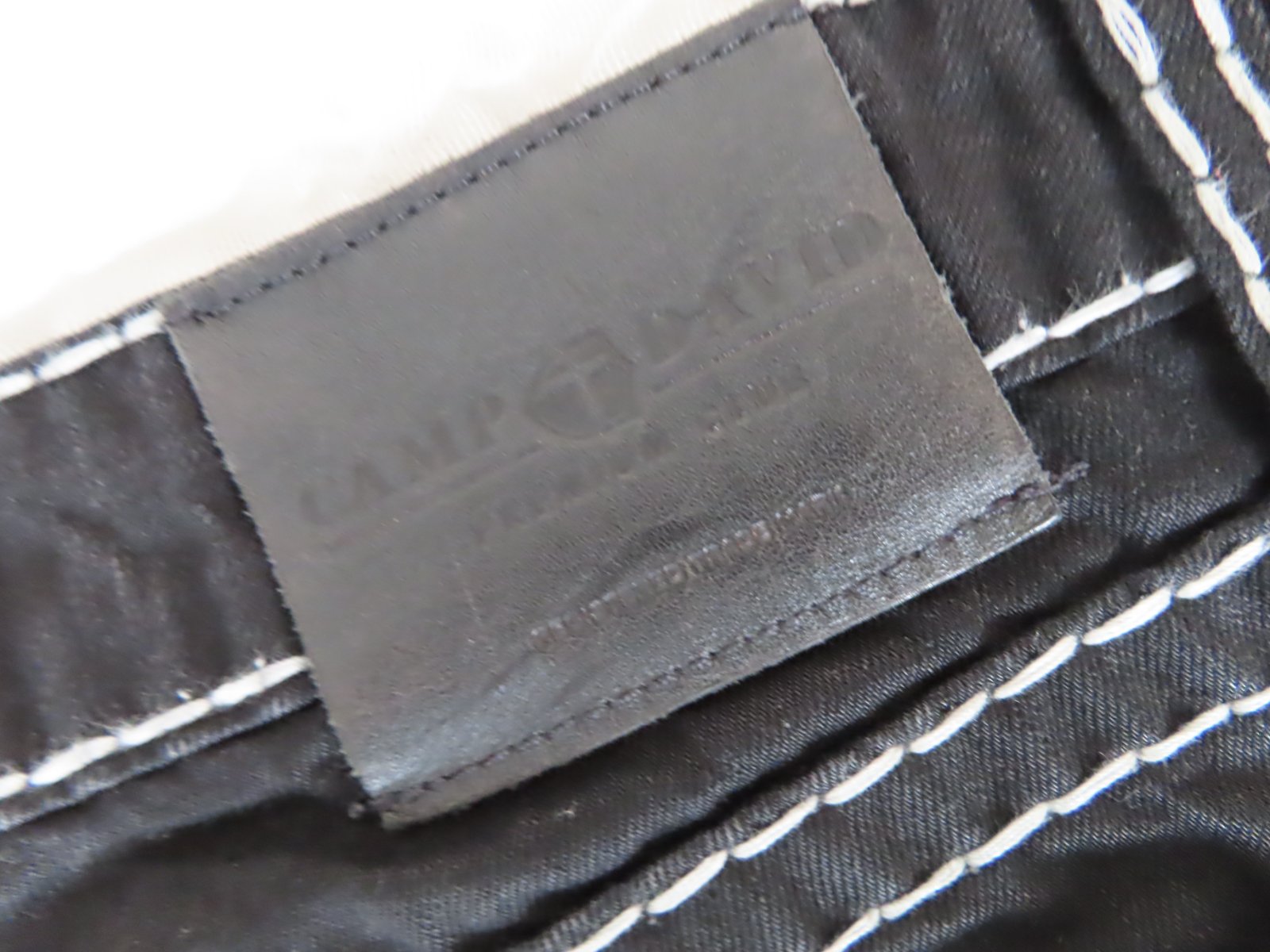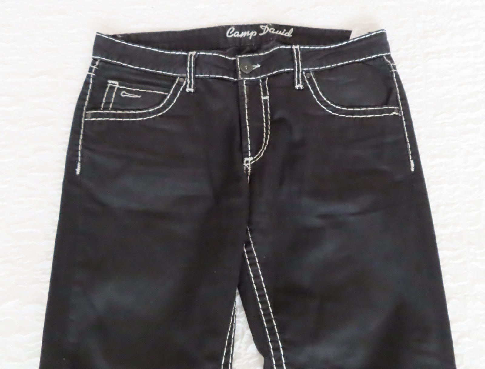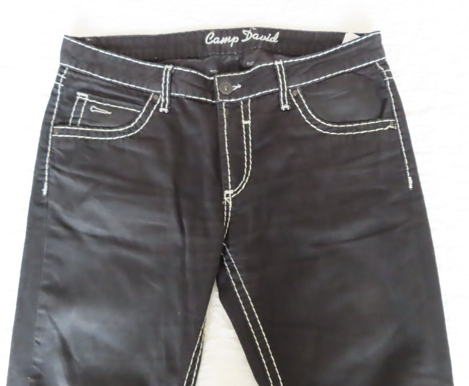 Čierne pánske rifle zn. Camp David, veľ. 36/32, rozmery: bočná dlžka 109cm, od rozkroku 79cm, pás 2x47cm. Predný sed 27cm, zadný sed 41cm,šírka nohavice dole 23cm