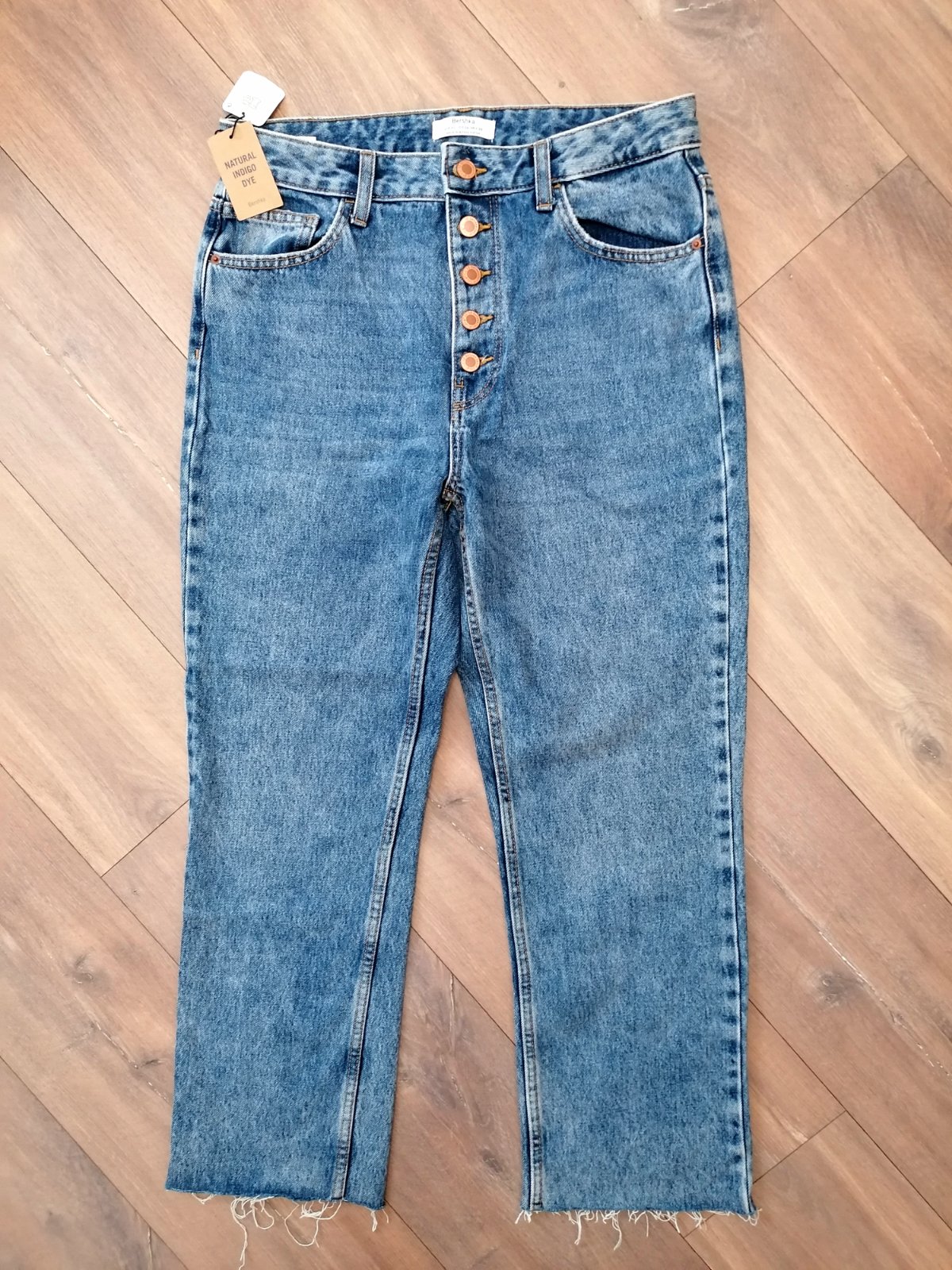 Ešte nové rifle s visackou, len odskúšané. Je to taky širší boyfriend strih, dĺžka 7/8. Pevnejšia riflovina, nie sú elastické. Pas 40 cm, dĺžka 97 cm.