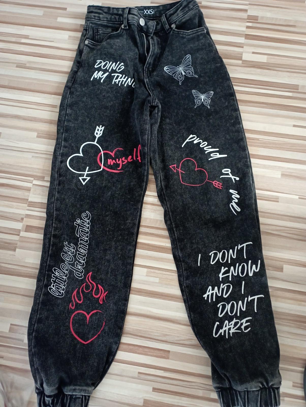 Asi 2x oblečené rifle. Veľkosť písaná XXS.