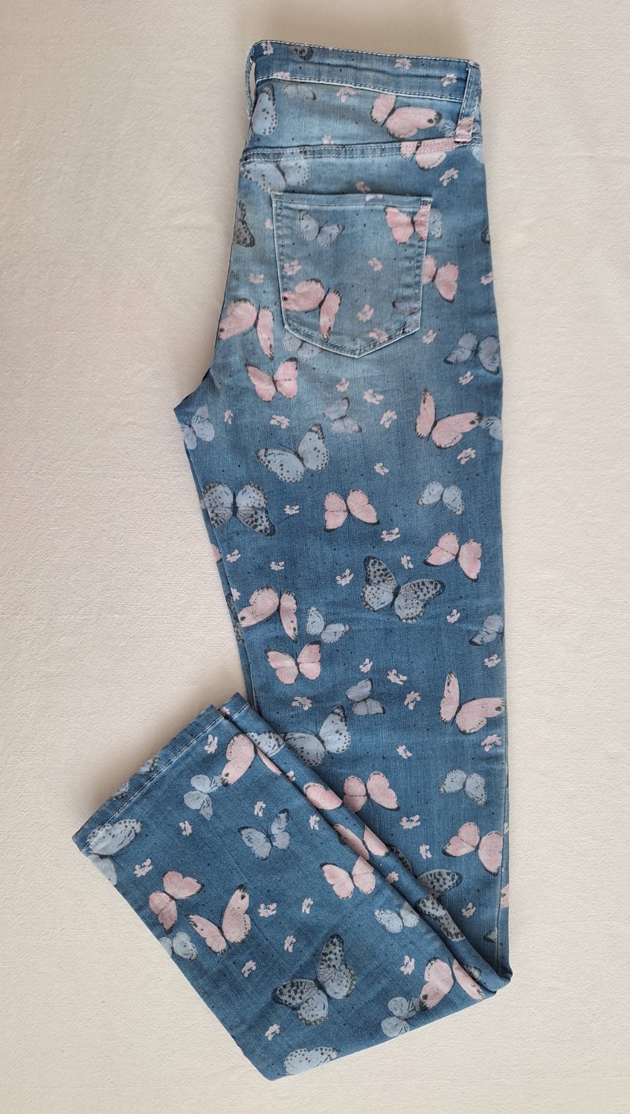 Pekná bledotyrkysová farba, na fotkách žiaľ nie je vidieť. Dcéra ich vôbec nemala oblečené, ale od nova majú žlté fliačiky na zadku (zohľadnené v cene), ale ku dlhšej tunike, alebo tričku v pohode...