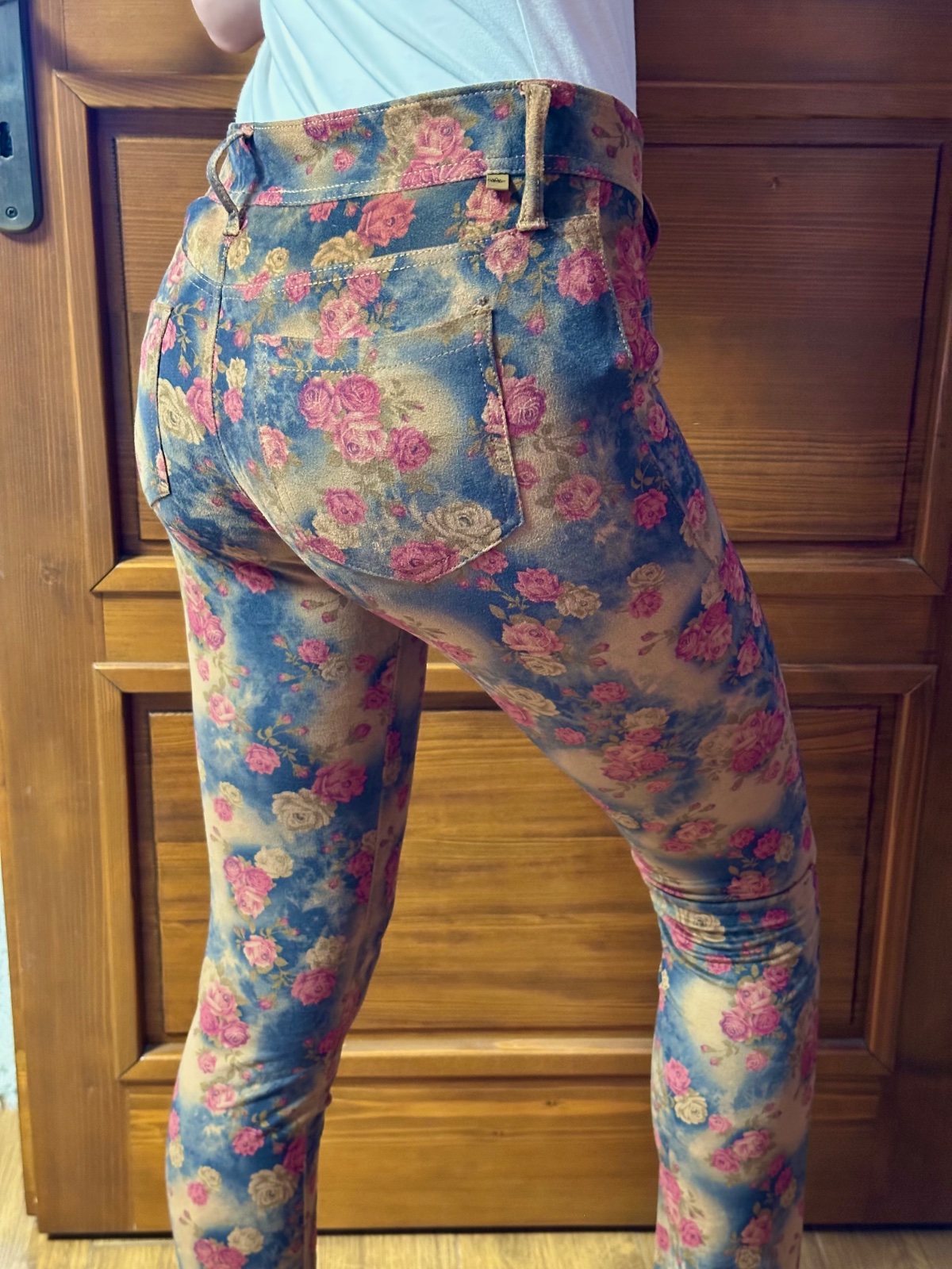 Predam dámske elastické nohavice veľkosti S sú veľmi pohodlné, vyrobené z jemného a pružného materiálu, ktorý pripomína legíny, no pritom obsahuje klasický predný zips, opaskové pútka a dve zadné vrecká. Celoplošný kvetinový vzor v kombinácii ružových ruží a modro‑pieskovej farby dodáva nohaviciam hravý a romantický nádych. Nohavice sú bez poškodení.