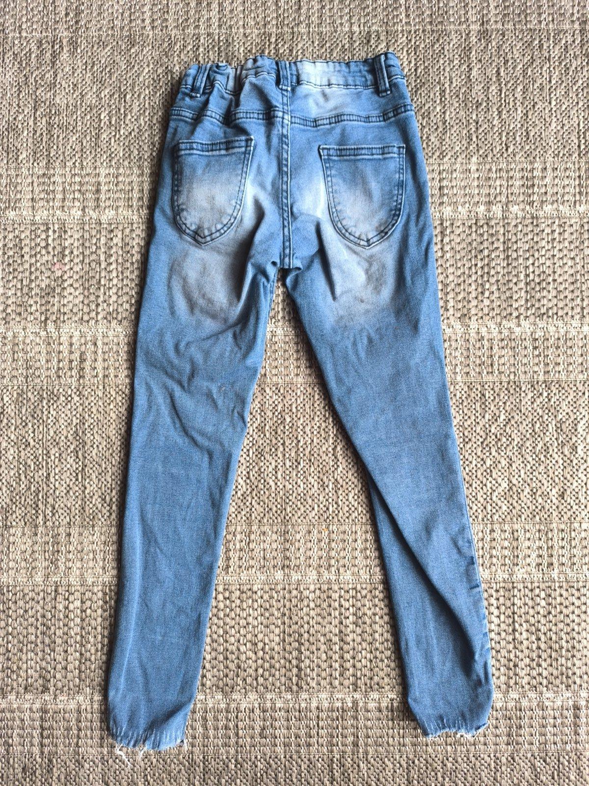 Moderné trendy dierované džínsy, mierne elastické, veľkosť 134. Dĺžka 72cm, šírka v páse 30-34cm, dá sa stiahnuť pomocou gumičiek a gombíkov.