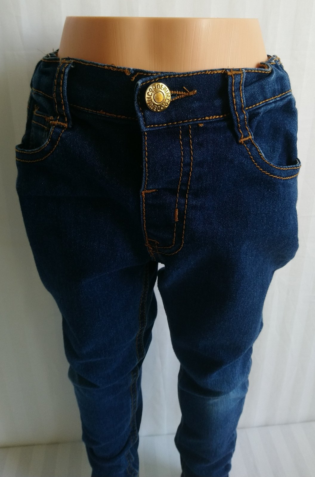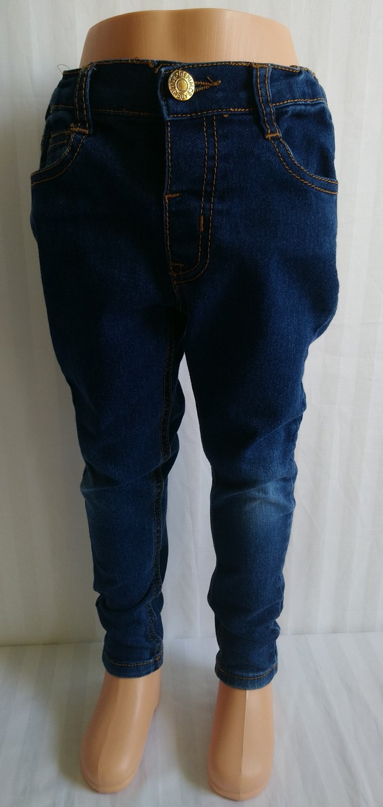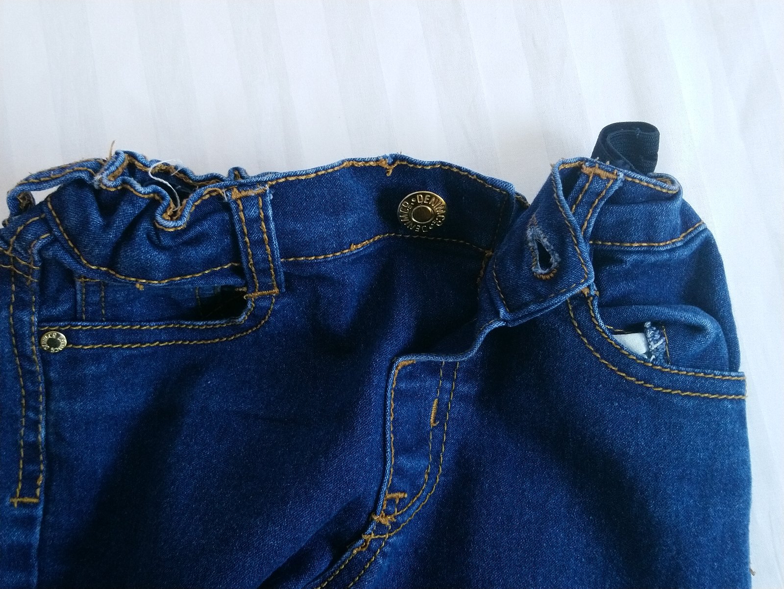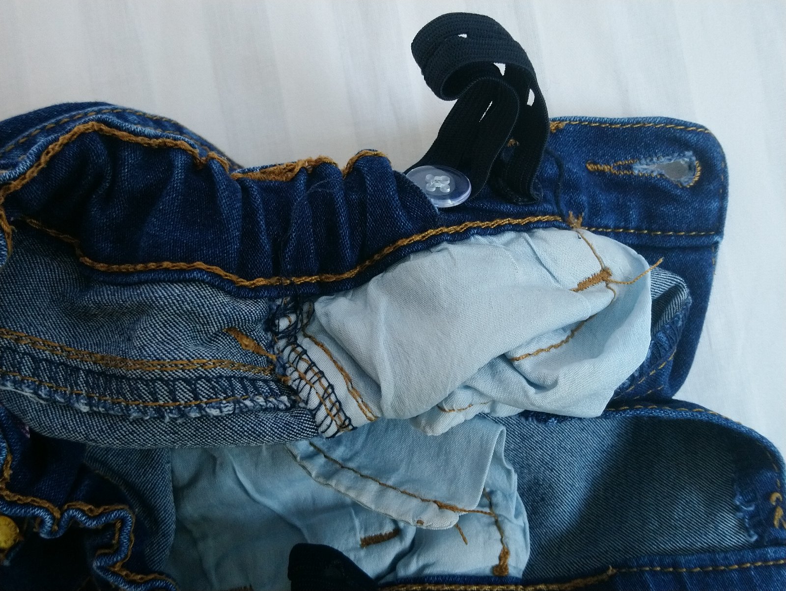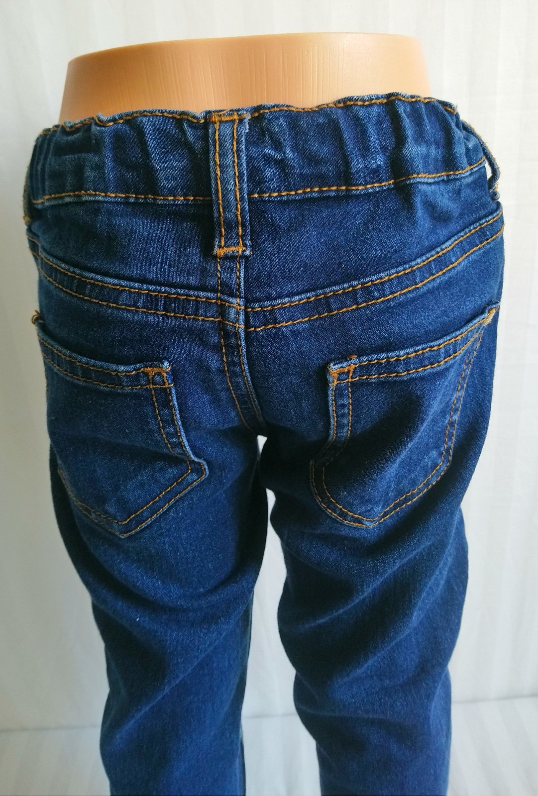 modré tenké elastické rifle s gumičkou na nastavenie v páse, zapínanie na patent , nie je zips, vrecká vpredu a vzadu,