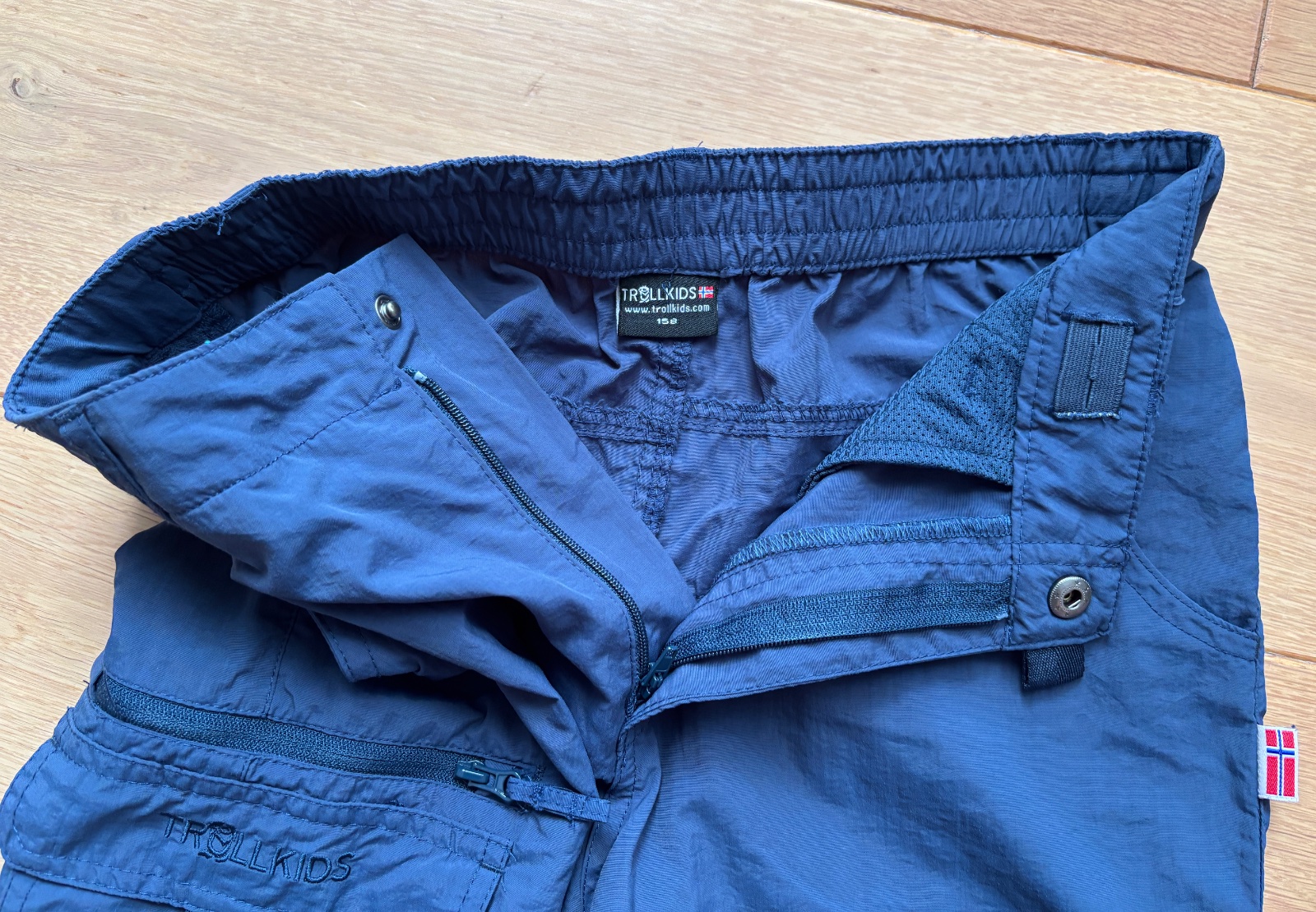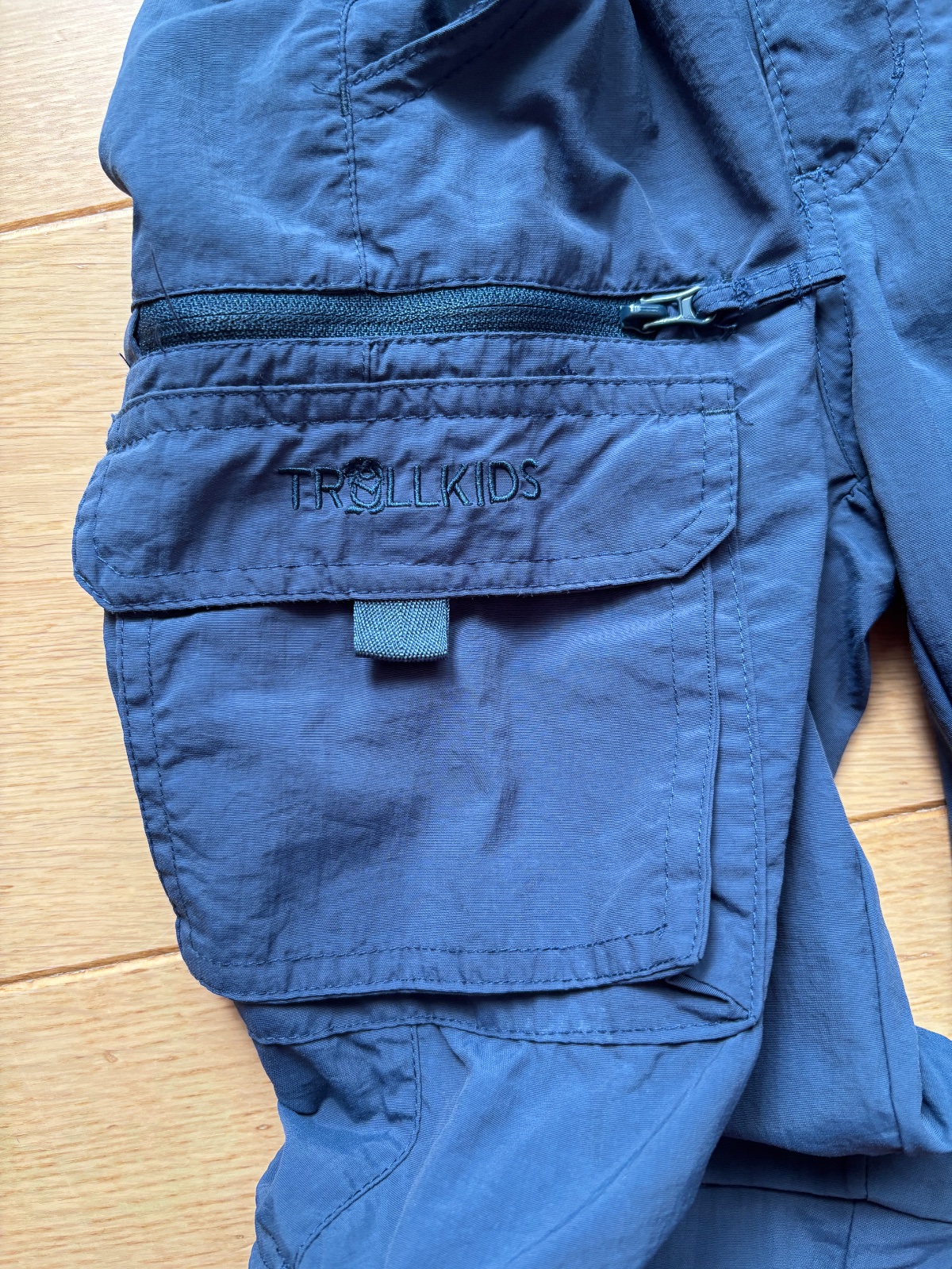 Tenučké nohavice s odzipsovateľnou spodnou časťou. Materiál polyamid. V páse nastaviteľná guma (gombíkami), zapínanie na cvok. Značka Trollkids.