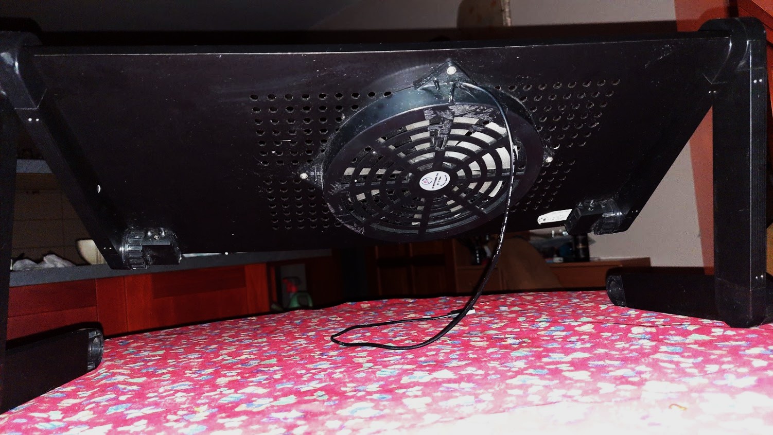 USB napájaný ventilátor, trvalo namontovaný pod stolom, robí prenosný počítač lepšie vetraným a znižuje riziko prehriatia.