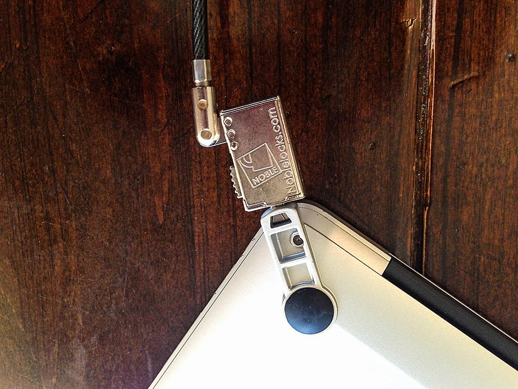 Kovová lišta zámku sa uchytí do 4 originálnych otvorov na MacBooku a do nej sa zamyká káblový bezpečnostný zámok. Je to pevná a nízkoprofilová lišta, takže MacBook je len trochu hrubší aj s lištou. Lišta má gumové protišmykové nožičky. Uchytenie zámku je smerom do strany šikmo dozadu, teda nebráni zapojeniu zariadení do portov počítača a umožnuje pohodlnú prácu.