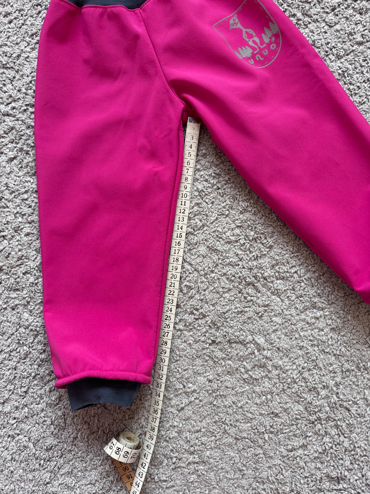 Kvalitné softshellové nohavice Unuo, zateplené fleecom. Top stav, jedna mini bodka pod kolienkom, fakt je malulinká, ťažko je ju zbadať. Vhodné do veterného a daždivého počasia, aj do snehu.