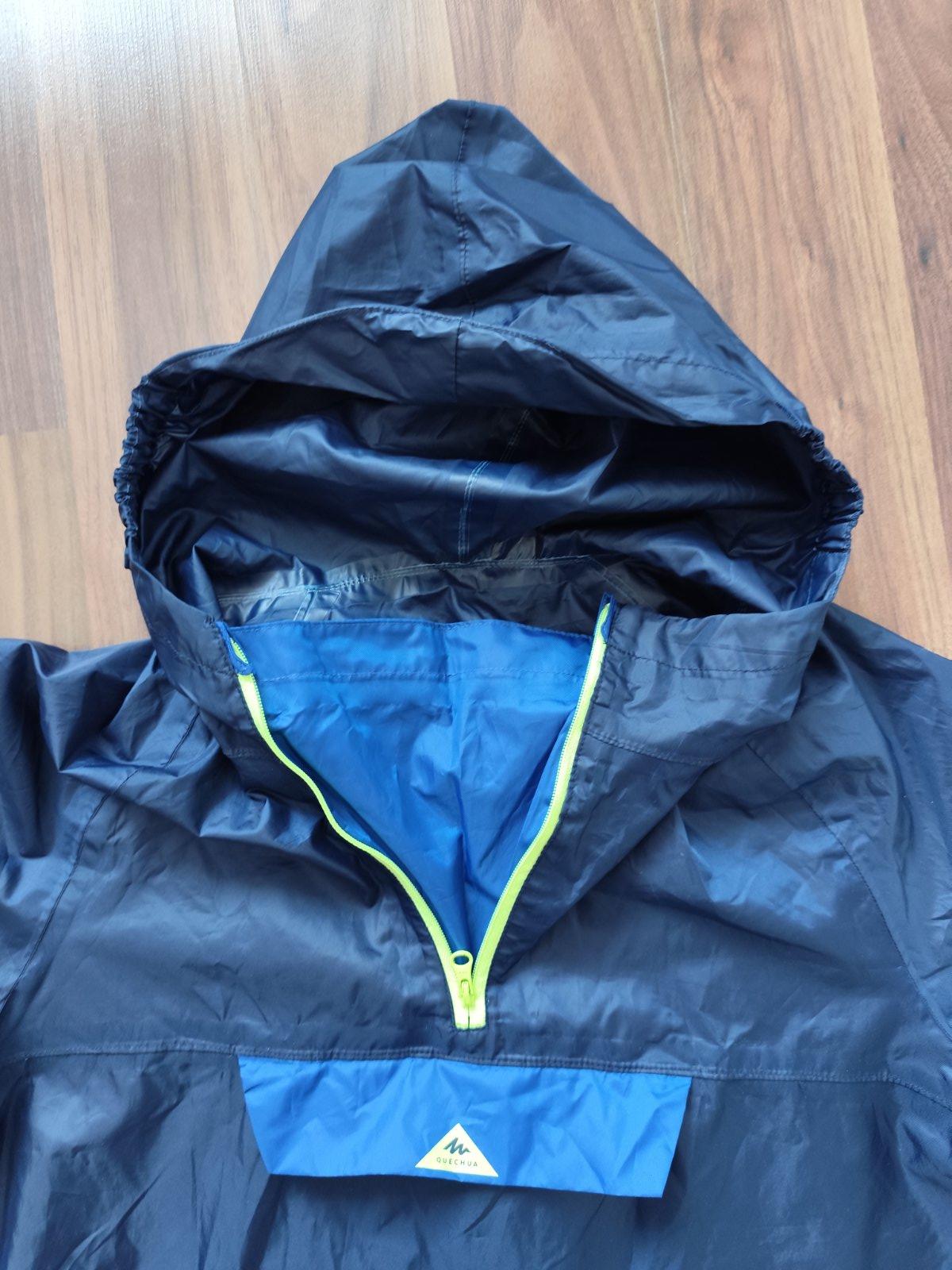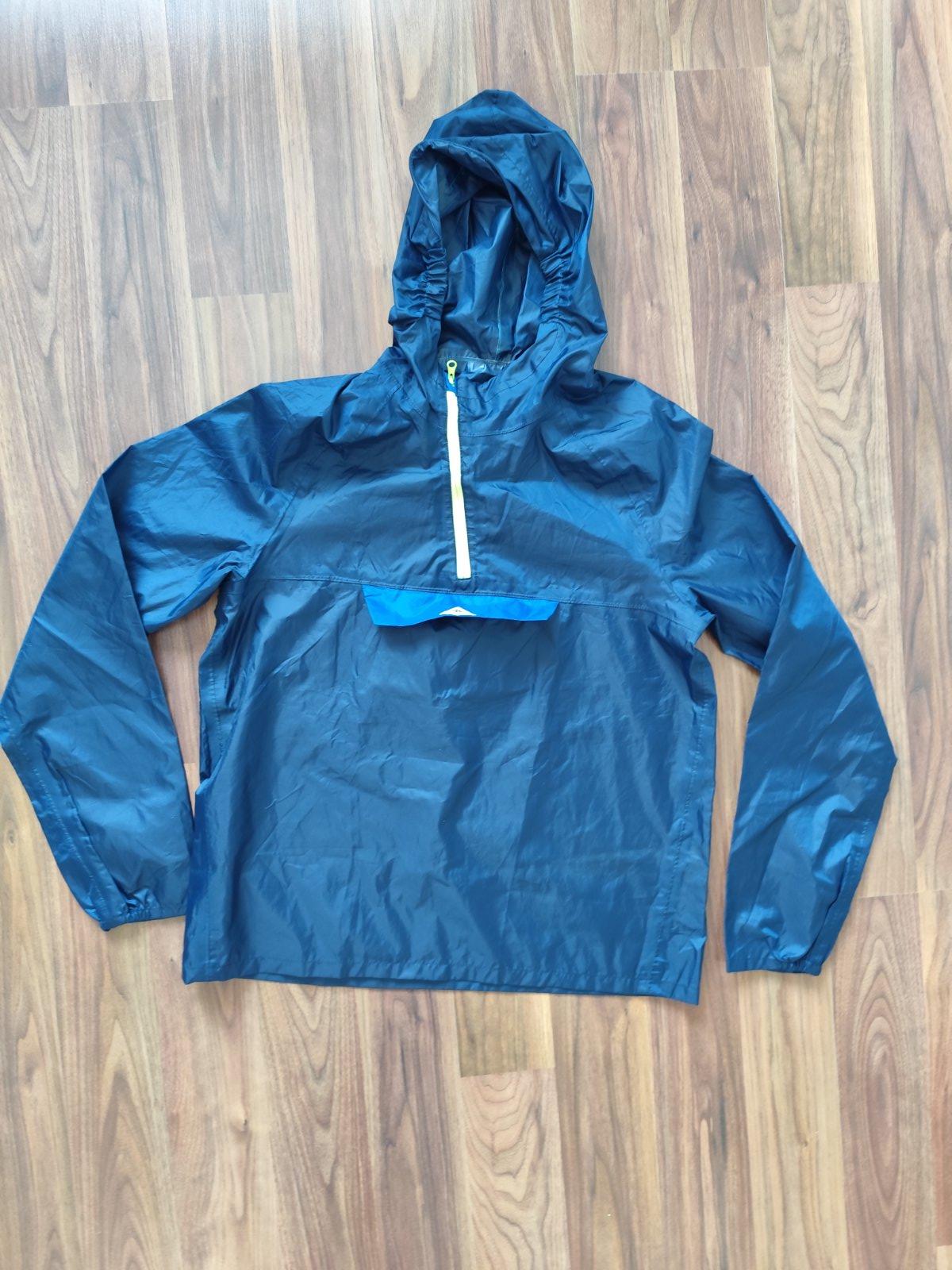 Bunda do dažďa. Veľkosť 158. Kapucňa sa nedá odopnúť, obliekanie cez hlavu. Na hrudi vrecko.