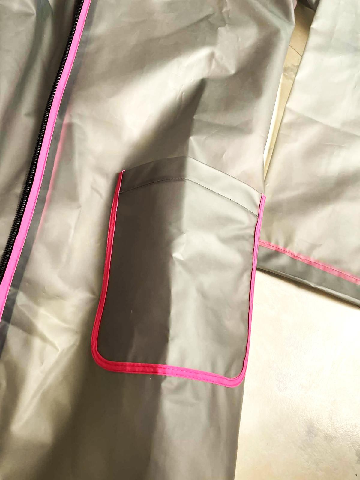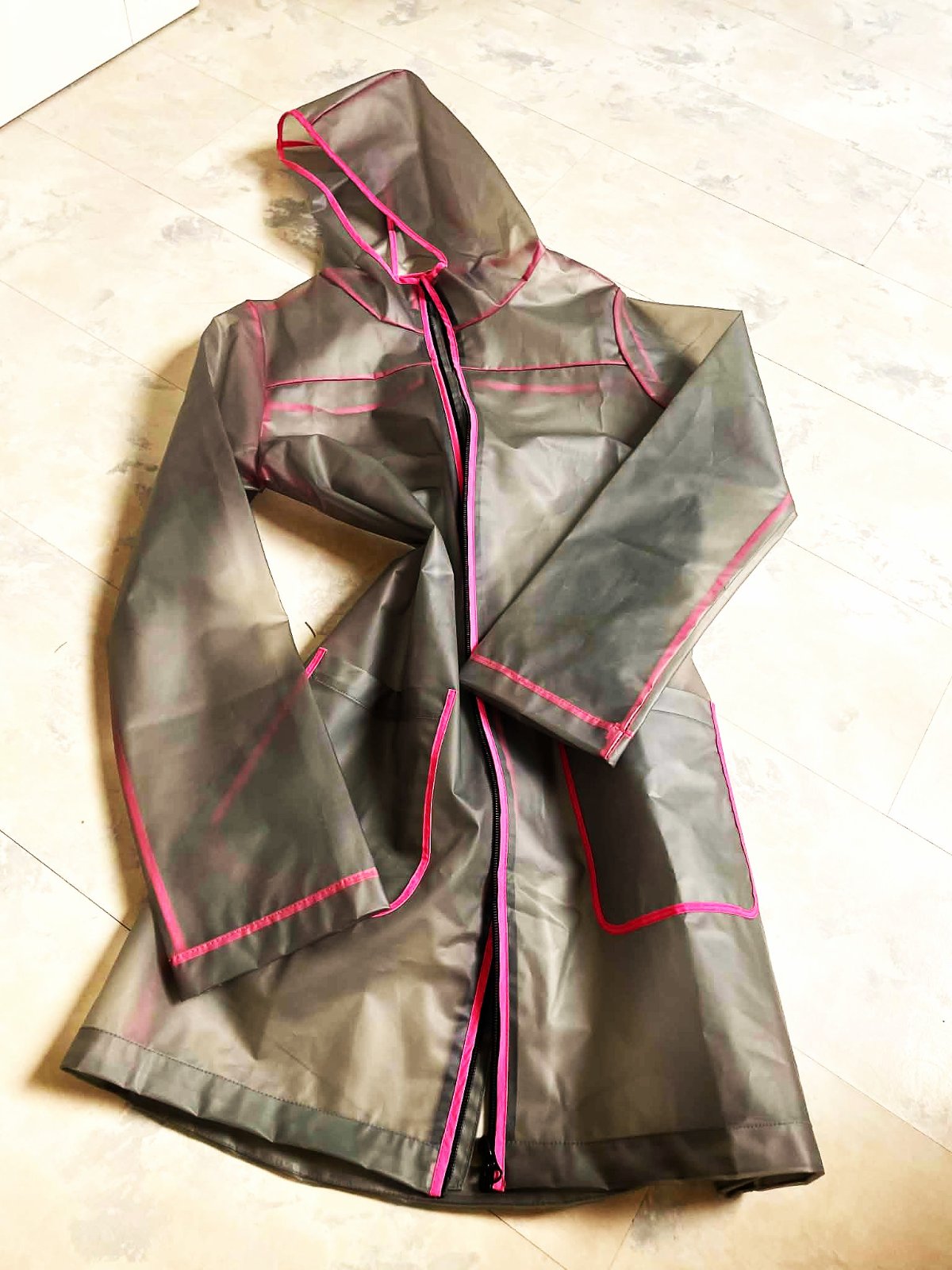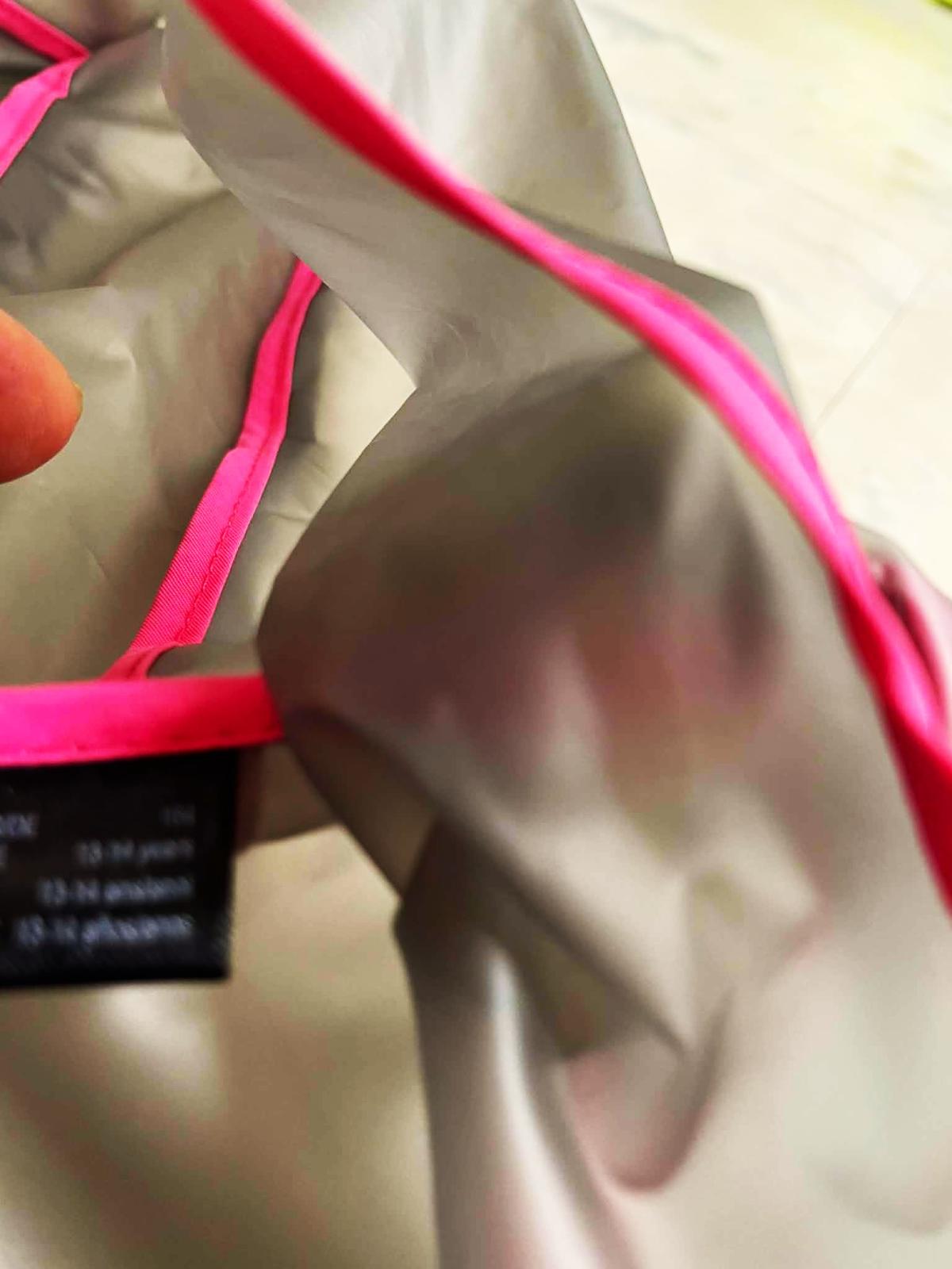 neznosený pevný hrubý pršiplášť v svetlošedom nádychu v kombinácii s jemne neónkovou ružovou,po bokoch veľké vrecká,min.nisený,veľkosť a značka vyfotené