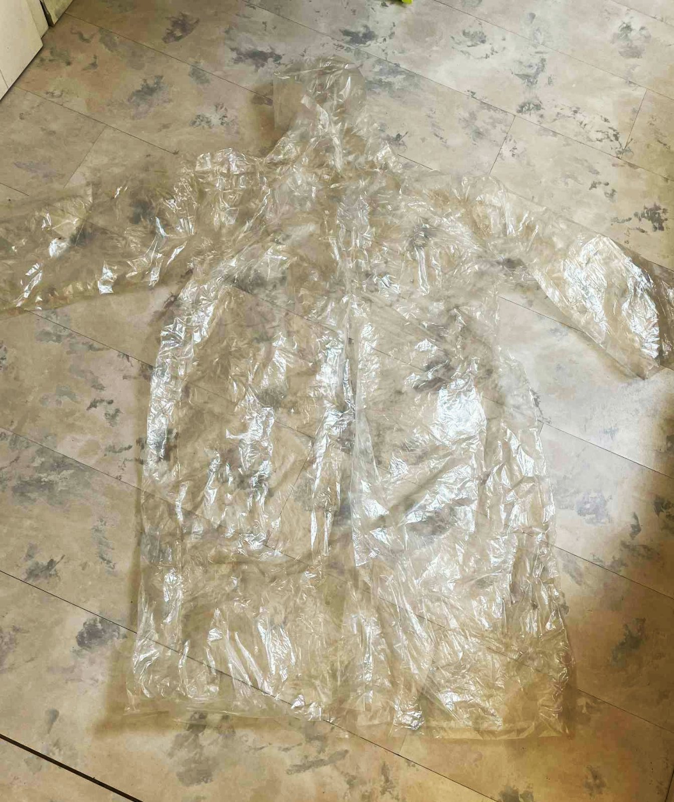 skladný pršiplášť z hrubšieho igelitu s kapucňou, dlžka = 108 cm,šírka 65 cm