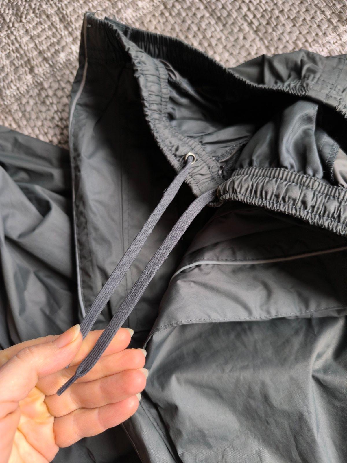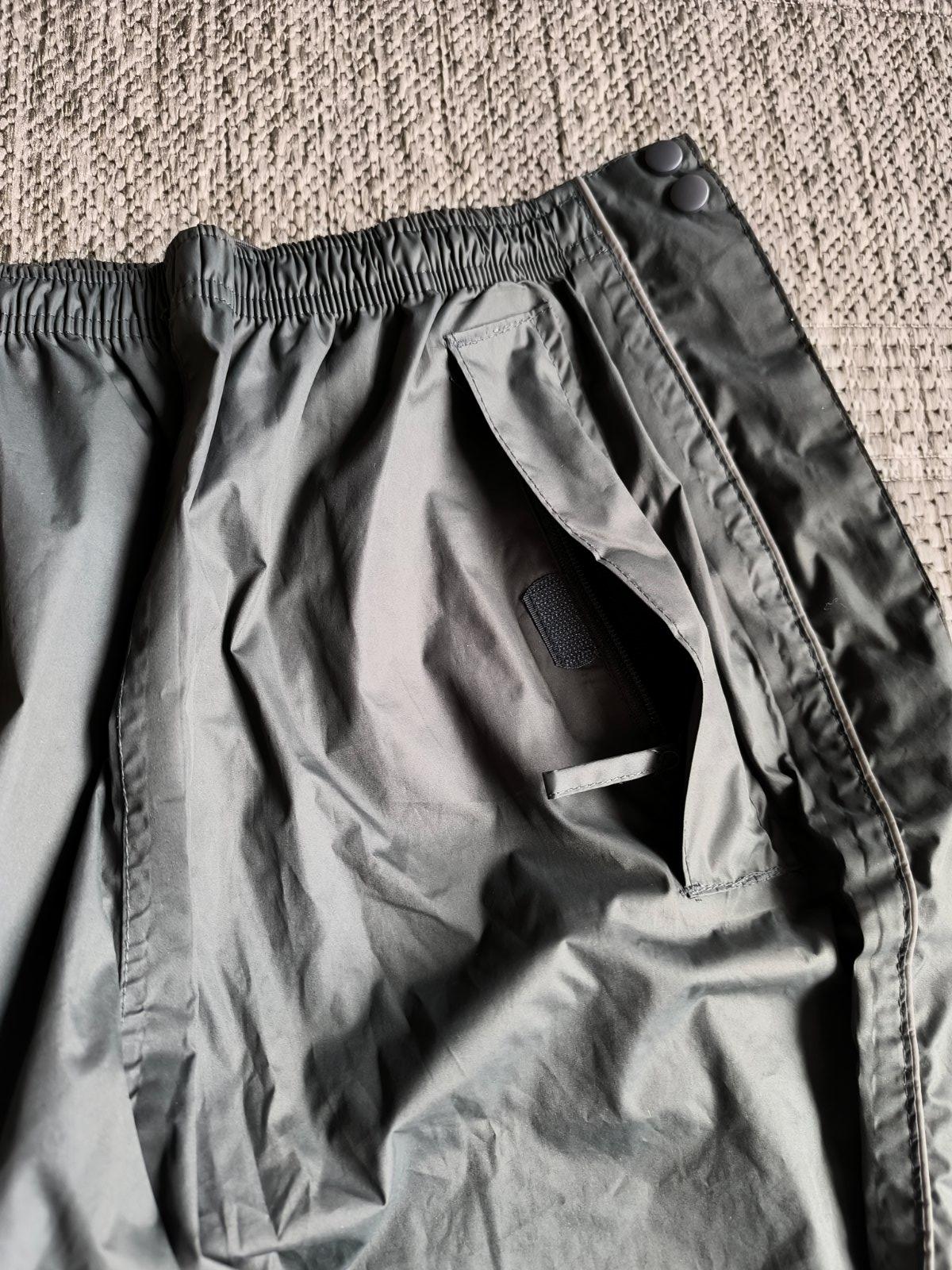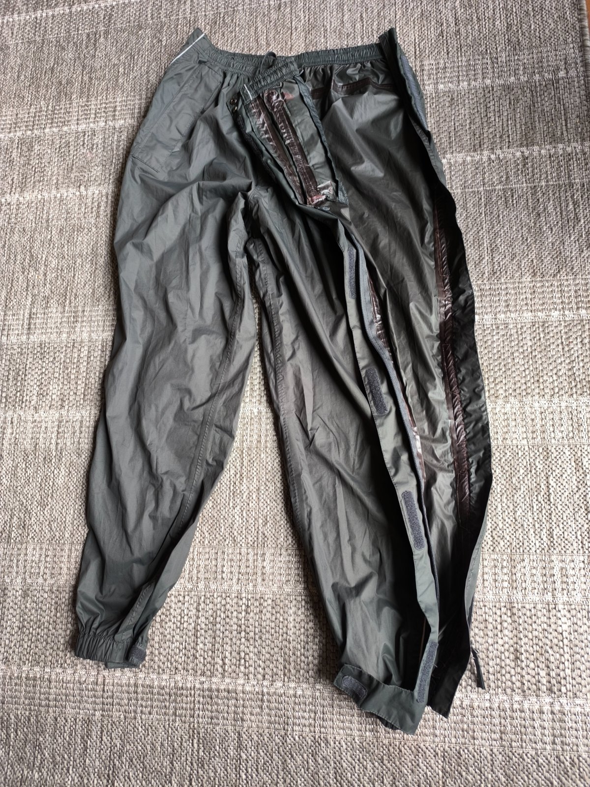 Nepremokavé nohavice do dažďa, dajú sa po stranách celé rozopnúť a tak ľahko obliecť keď začne pršať. Preto sú vhodné napr. na turistiku. Môžete ich nosiť napríklad aj v batohu ako rezervné oblečenie pre prípad nepriaznivého počasia, a keď treba ľahko navlečiete priamo v teréne. Sú vodeodolné a majú podlepené švy, takže nepremoknú, neprefúknu. Spodné lemy sa dajú pomocou suchého zipsu upraviť tak, aby dobre obopínali obuv. Majú dve vrecká na zips. V páse sa dajú regulovať šnúrkou. V super stave. Veľkosť 44/46, ale sedia aj 42, lebo v páse upravíte podľa potreby. Dĺžka 107cm, šírka v páse 38-50cm.