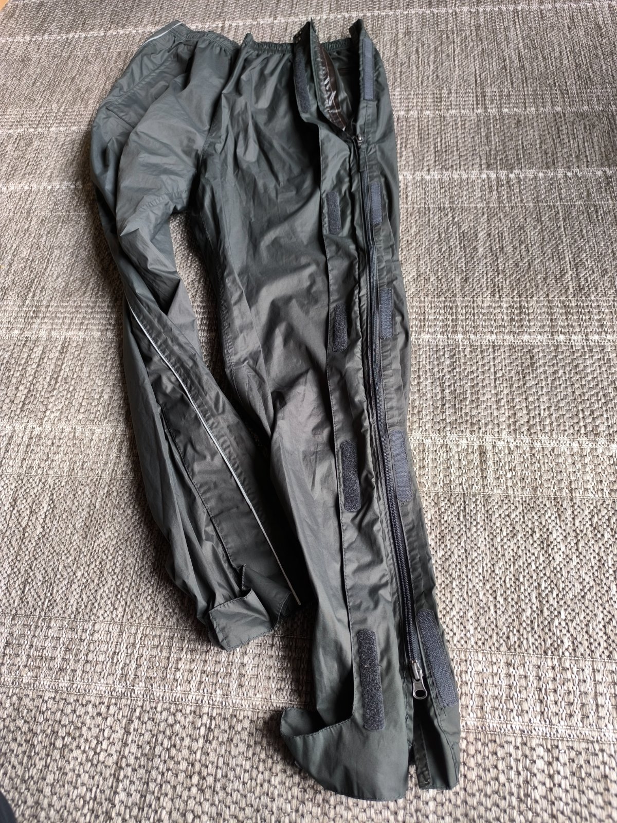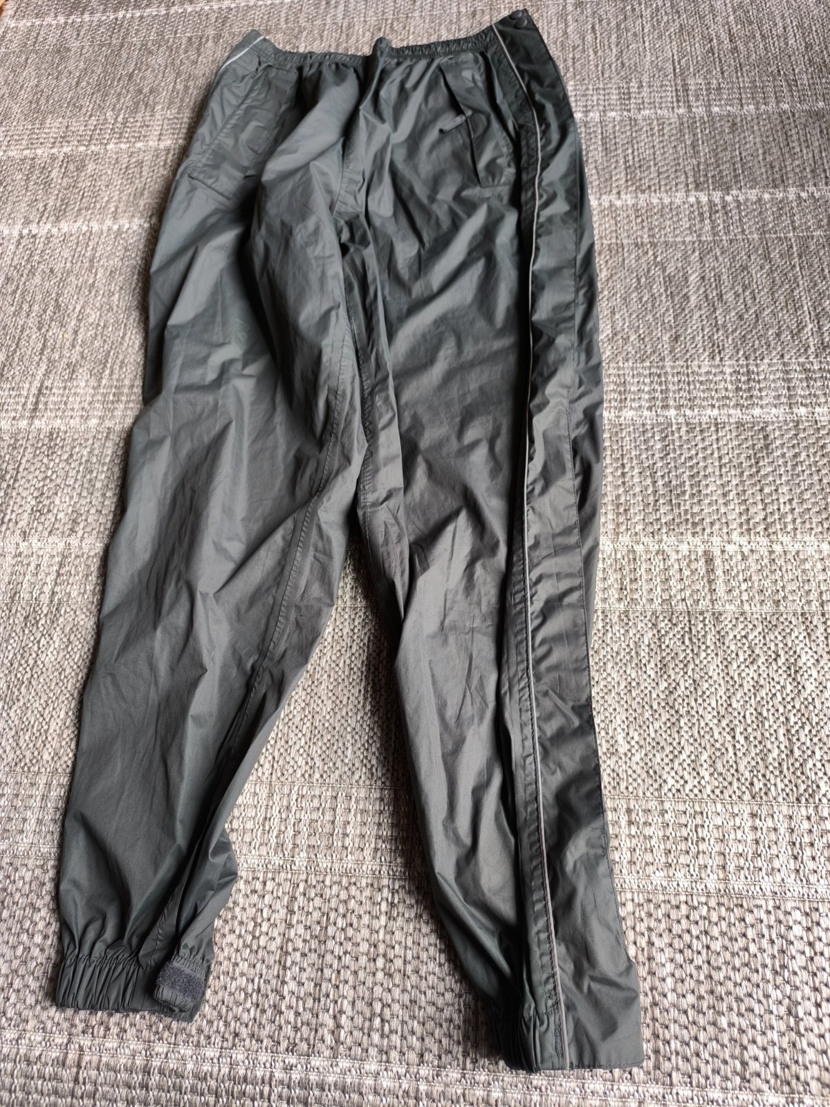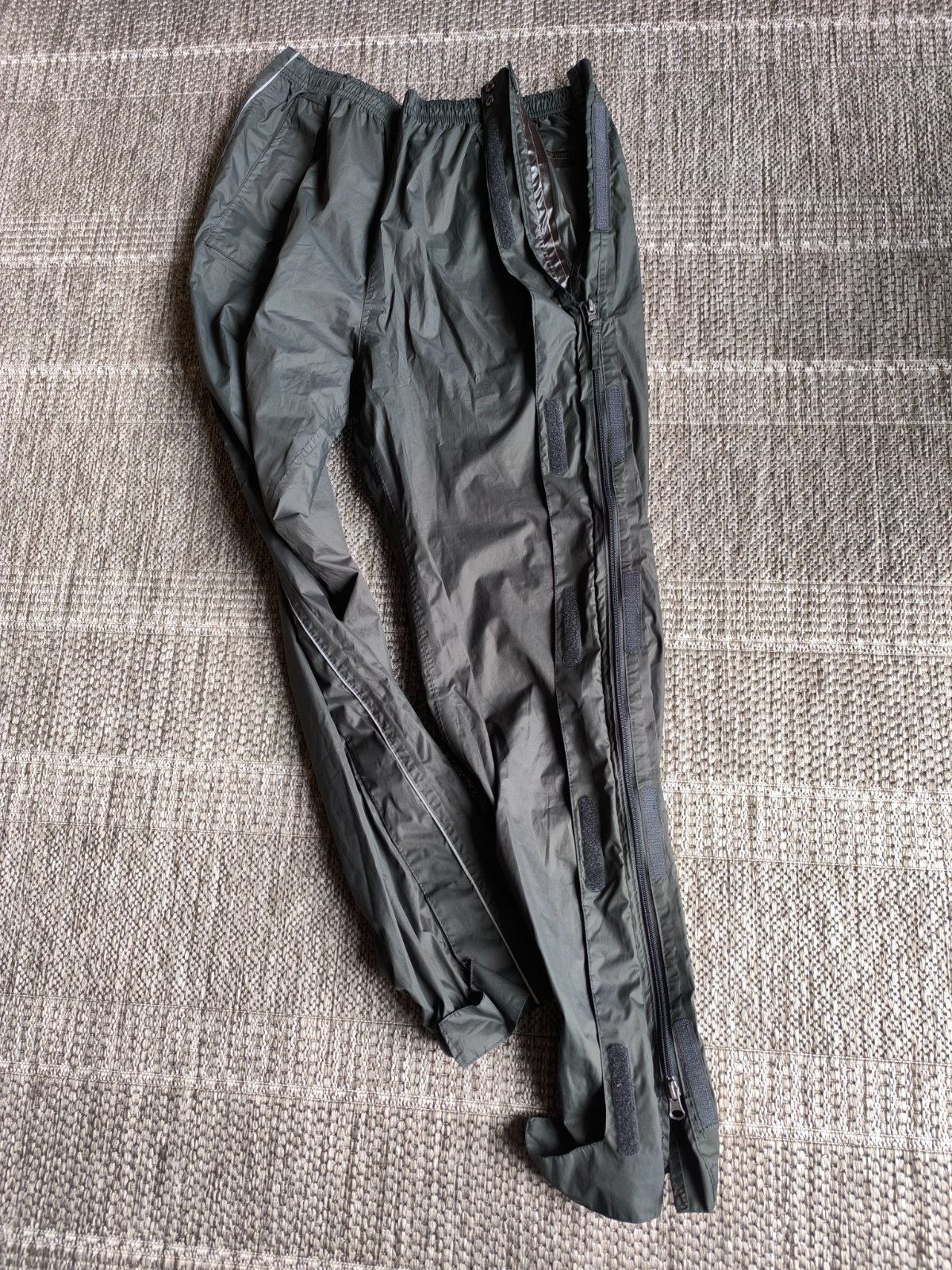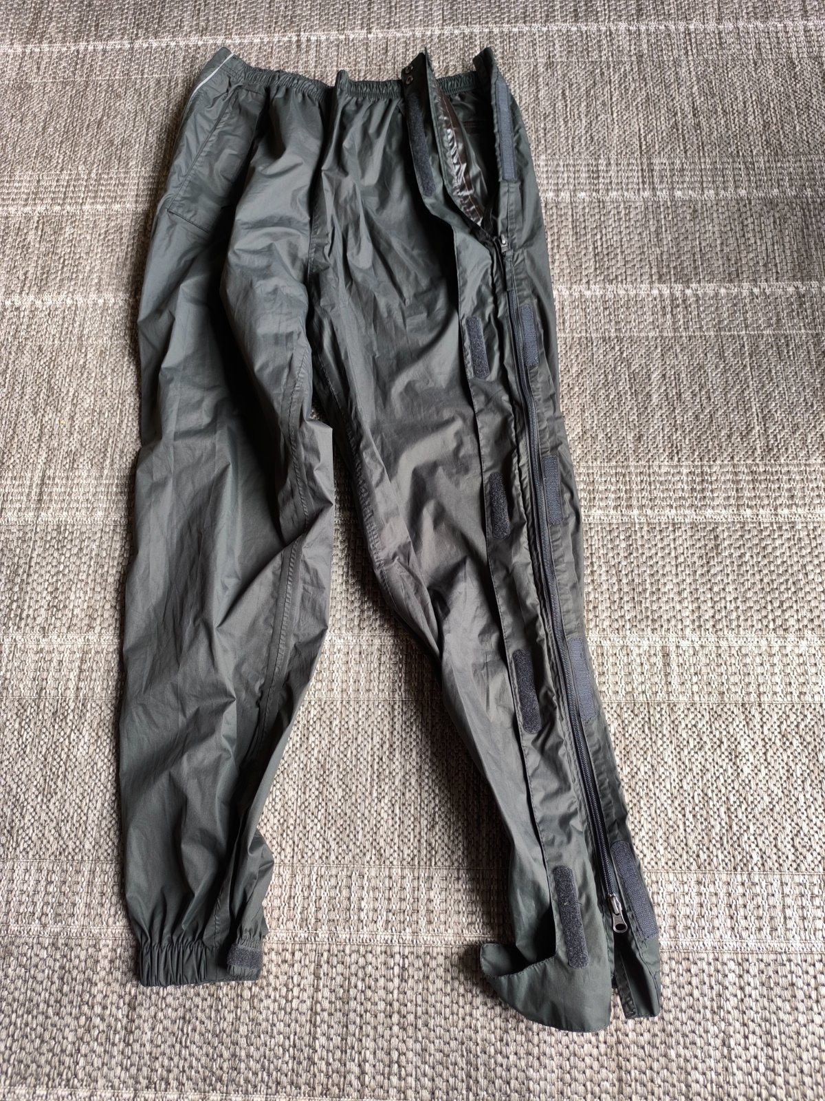 Nepremokavé nohavice do dažďa, dajú sa po stranách celé rozopnúť a tak ľahko obliecť keď začne pršať. Preto sú vhodné napr. na turistiku. Môžete ich nosiť napríklad aj v batohu ako rezervné oblečenie pre prípad nepriaznivého počasia, a keď treba ľahko navlečiete priamo v teréne. Sú vodeodolné a majú podlepené švy, takže nepremoknú, neprefúknu. Spodné lemy sa dajú pomocou suchého zipsu upraviť tak, aby dobre obopínali obuv. Majú dve vrecká na zips. V páse sa dajú regulovať šnúrkou. V super stave. Veľkosť 44/46, ale sedia aj 42, lebo v páse upravíte podľa potreby. Dĺžka 107cm, šírka v páse 38-50cm.