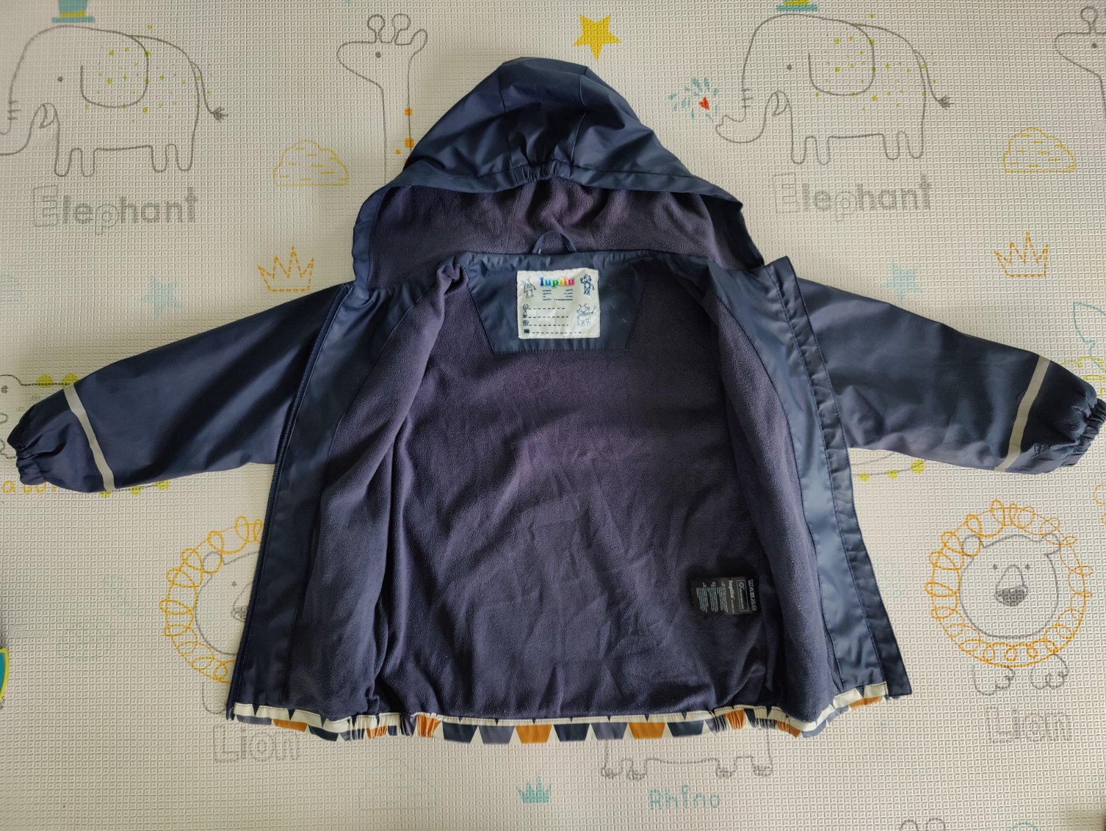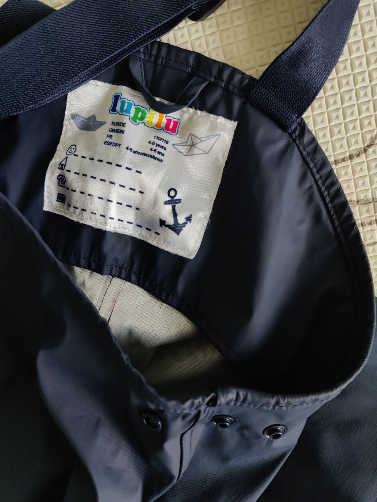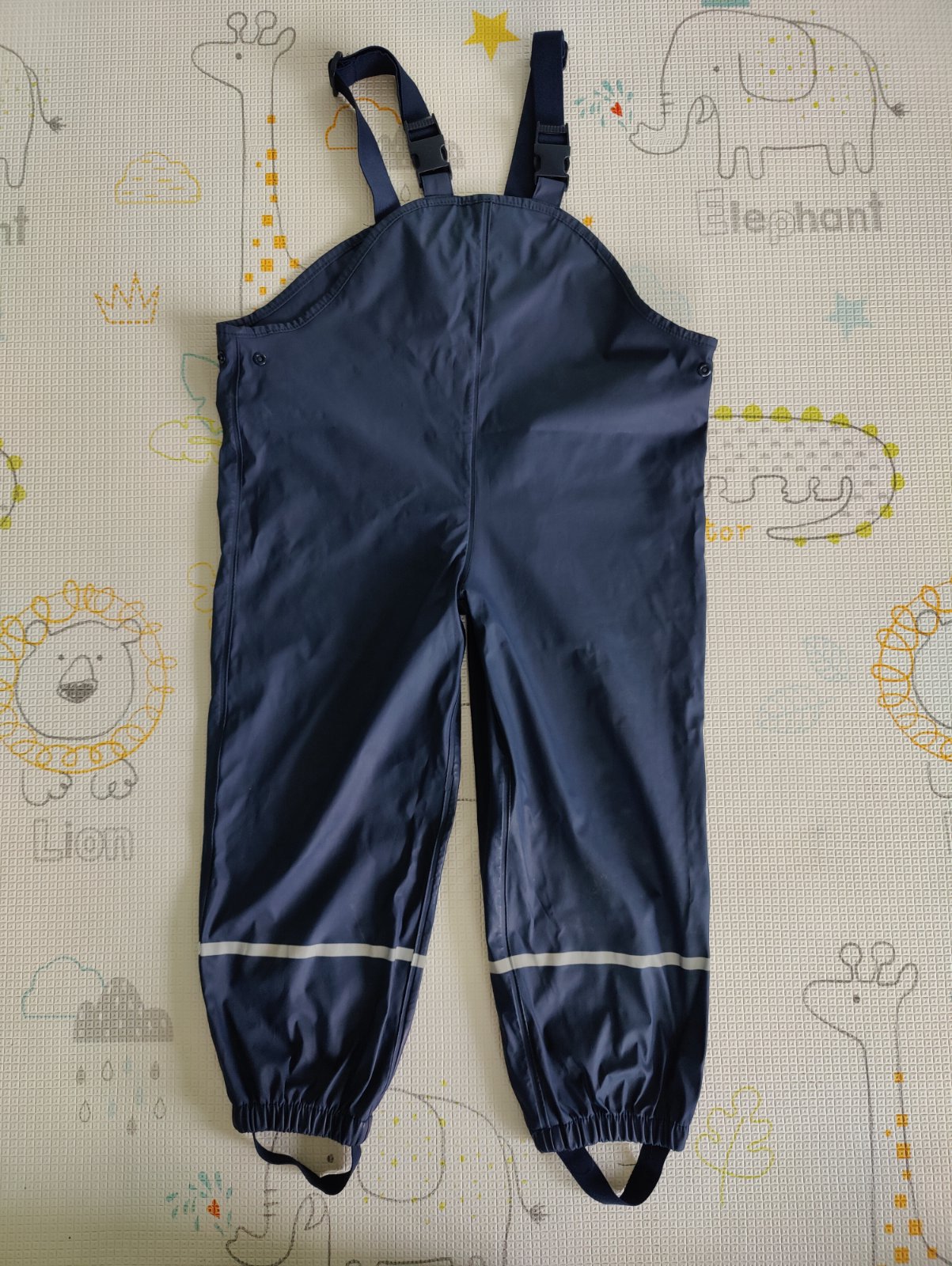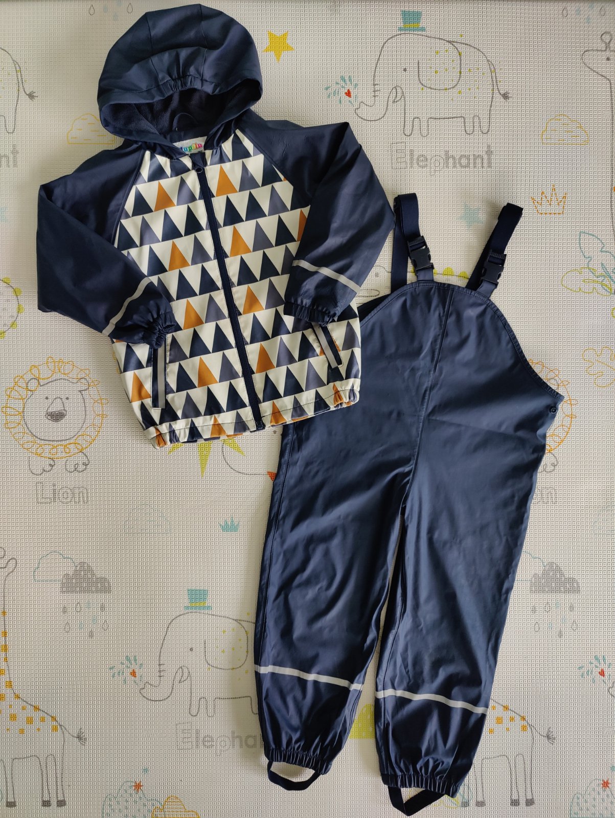 Predám chlapčenskú súpravu do dažďa značky Lupilu. Veľkosť 110/116 na 4-6 rokov. Farba tmavomodrá v kombinácii s okrovožltou a bielou. Nohavice sú nezateplené, veľmi málo používané, top stav. Bunda je zateplená fleesom, nosená, ale v peknom stave. Na manžetách rukávov je trochu popukaná vrchná pogumovaná vrstva - vidno na foto.