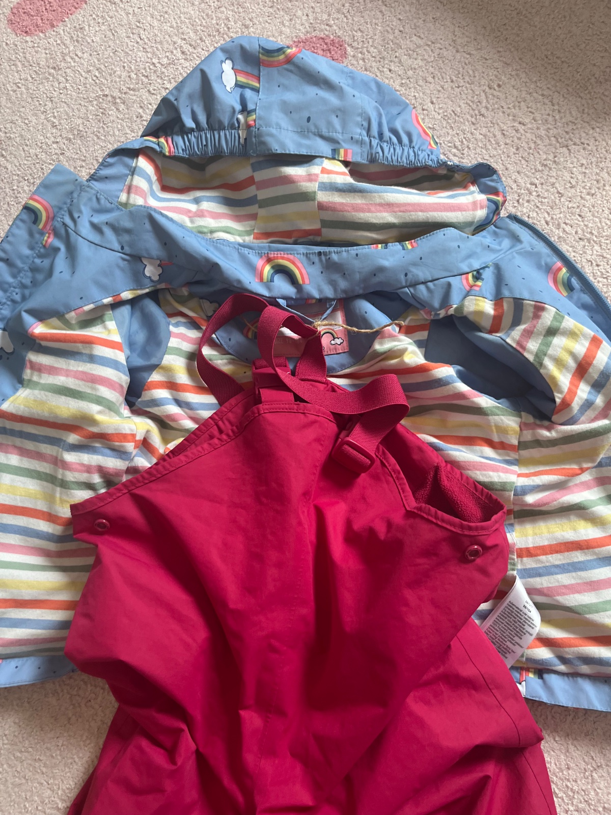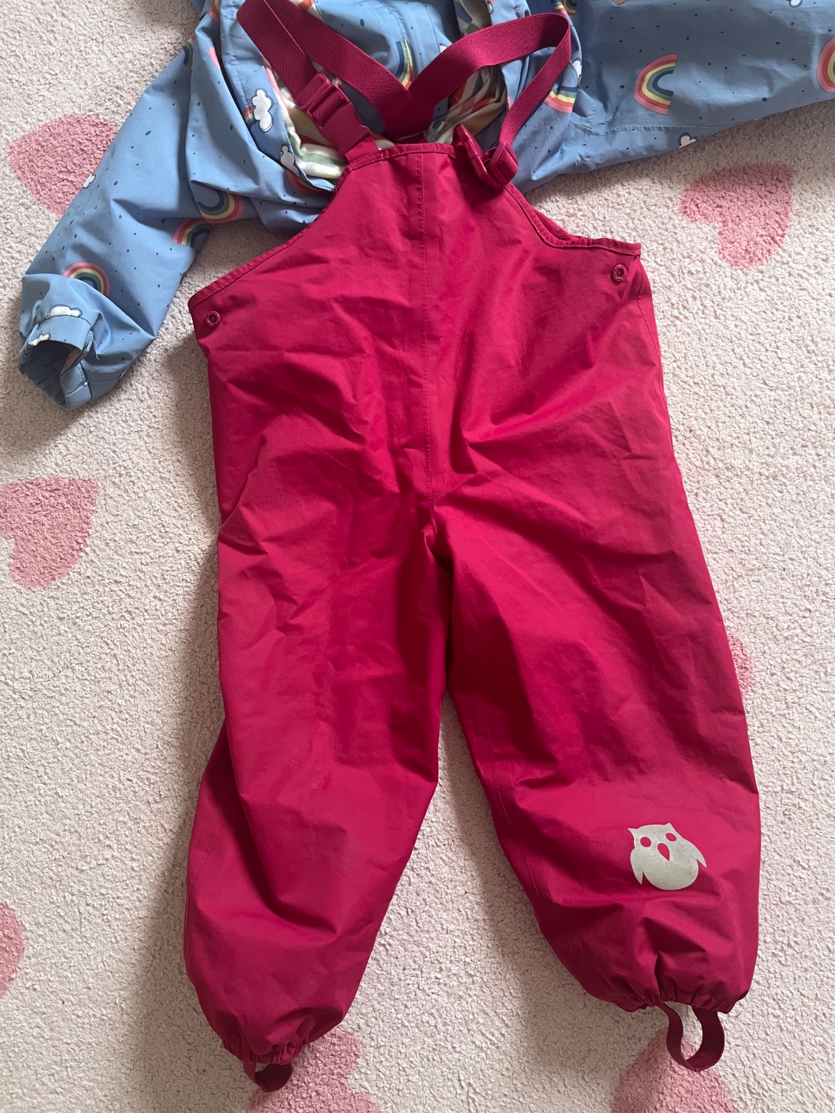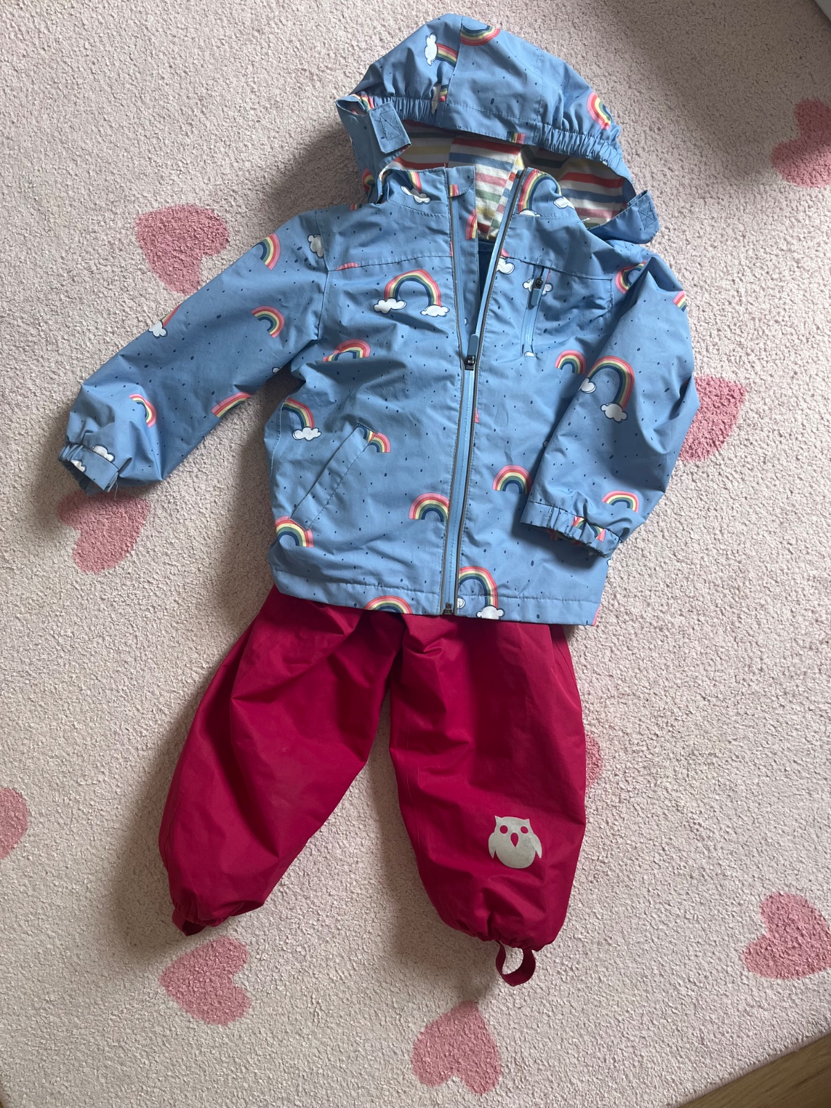 Nepremokavá bundička a nohavice do dažďa. 2 x oblečené, úplne ako nové. Bundička je zateplená ale nohavice nie (viď. foto). Cena spolu za komplet.