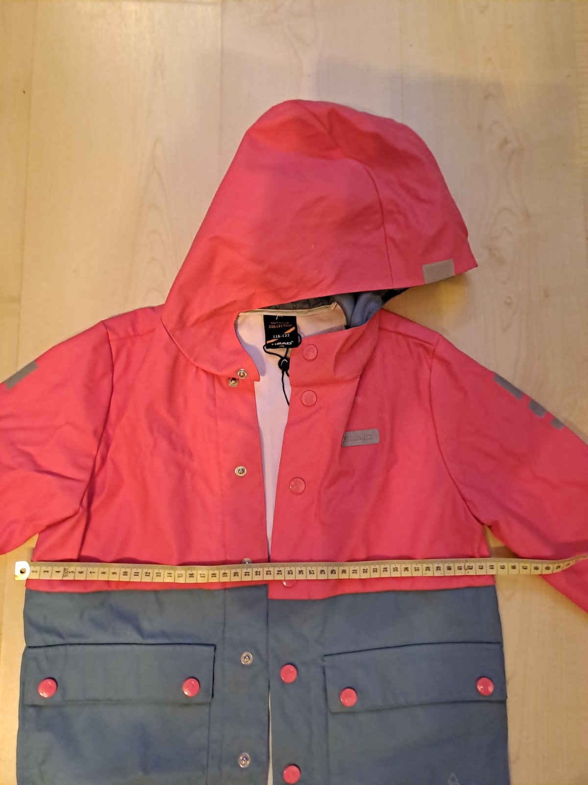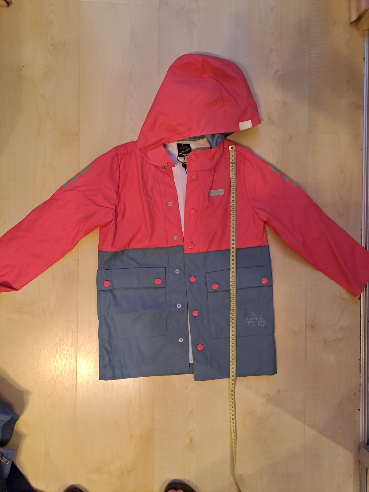 značka: next konce rukávov a v páse na gumu veľkosť: 164 13-14 100% polyester 2 spodné vrecká so záklopkou na patentné gombíky dĺžka: 77cm, cez prsia: 45cm, v páse: 37cm