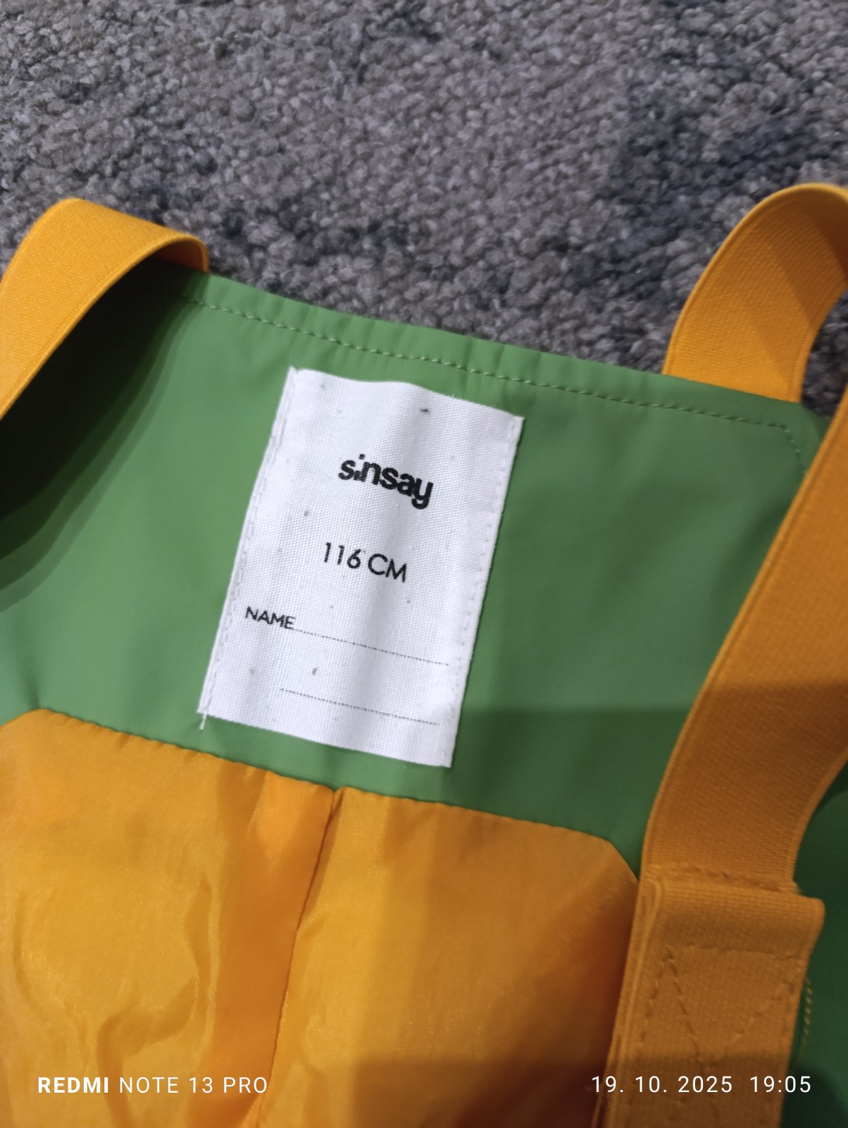 Chlapčenské nepremokavé nohavice do dažďa Sinsay, veľkosť 116. Nosené, nastaviteľné traky, dole na gumičku, majú pár fliačikov, inak bez poškodenia.