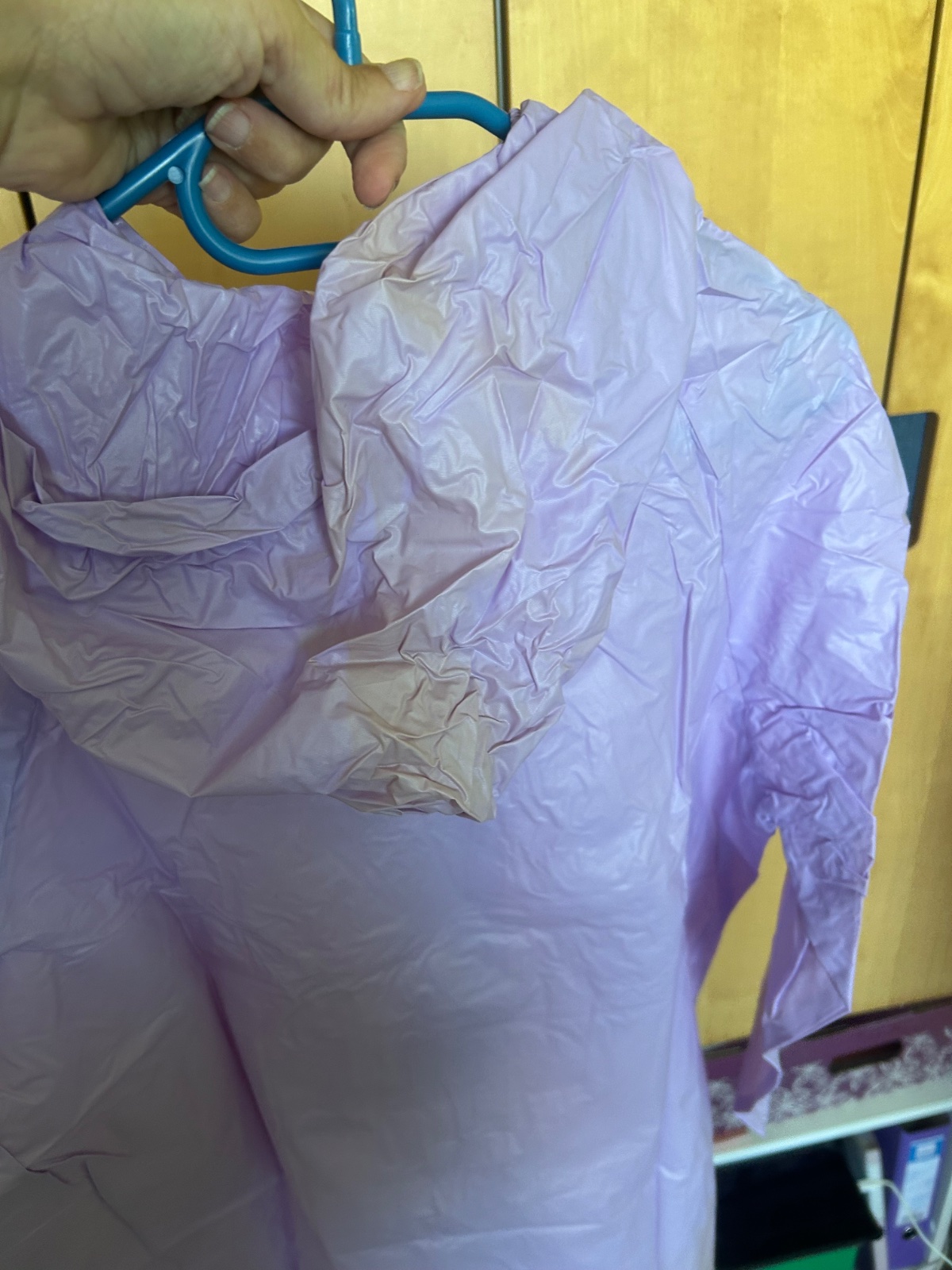 Dievčenský pršiplášť. Zapínanie je vpredu na patentky. Má nafukovaciu kapucňu. Dĺžka je 70cm,obvod hrudníka je 104cm a obvod pása je 100cm. Dĺžka rukáva je od krku 60cm