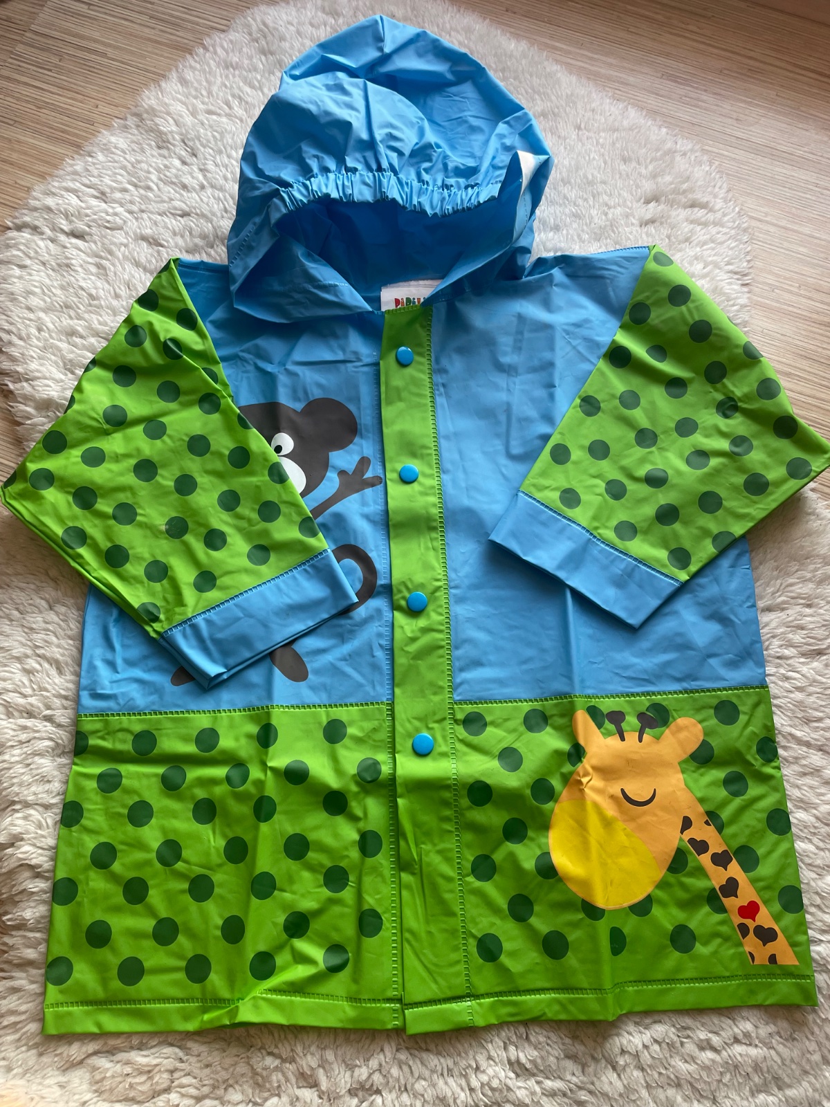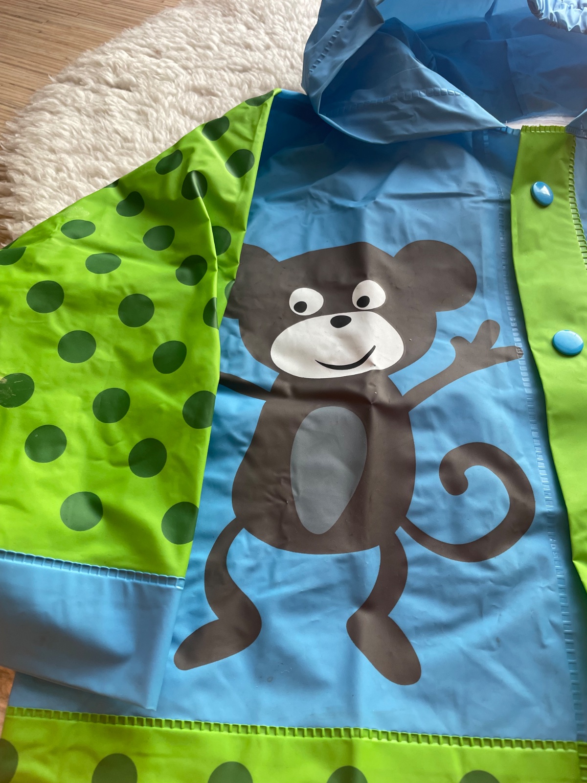 Zelenomodry prsiplast Pidilidi s motivom zvieratiek, velkost 3-4 r, kapucna so vsitou prednou gumou, zapinanie na cvocky, parkrat obleceny v skolke, jedine na kapucke dolu 1 cm roztrhnutie, vid foto