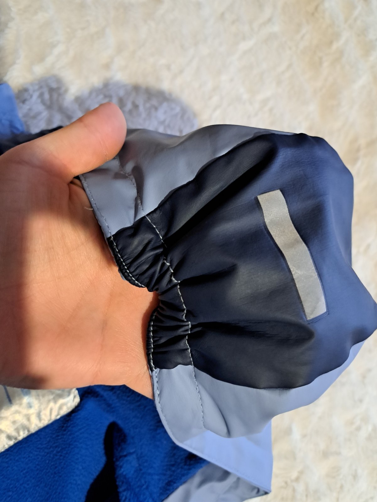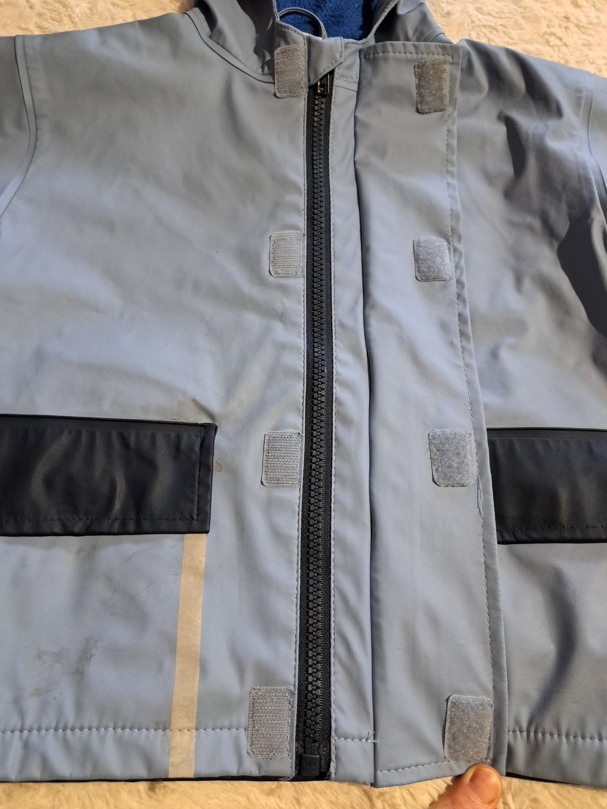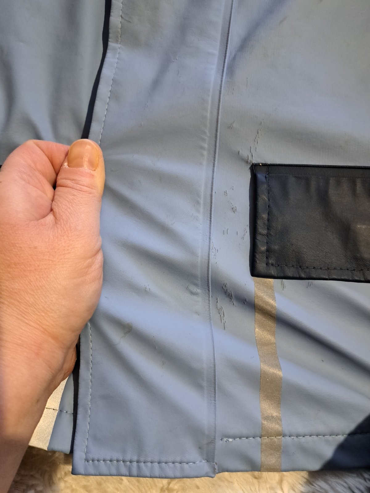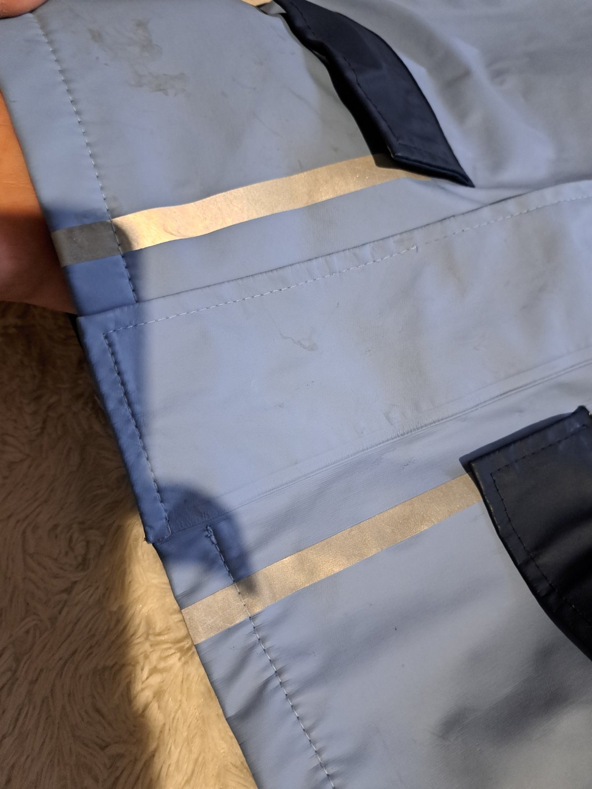 Má svoje chyby..všetko nafotené(flak na predu ..myslím že pôjde vyčistiť,predné vačky natiahnuté,a jedna strana na predu pri vačku popraskaná látka je vidno len po natiahnutí)inak je stále nositelná a pekná.S reflexnými prvkami
