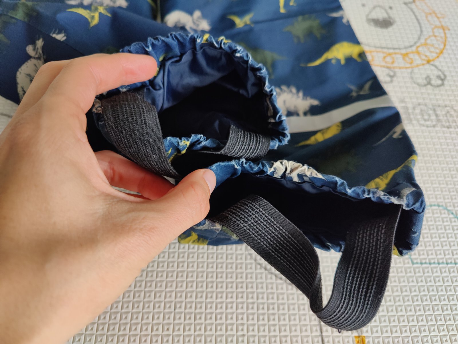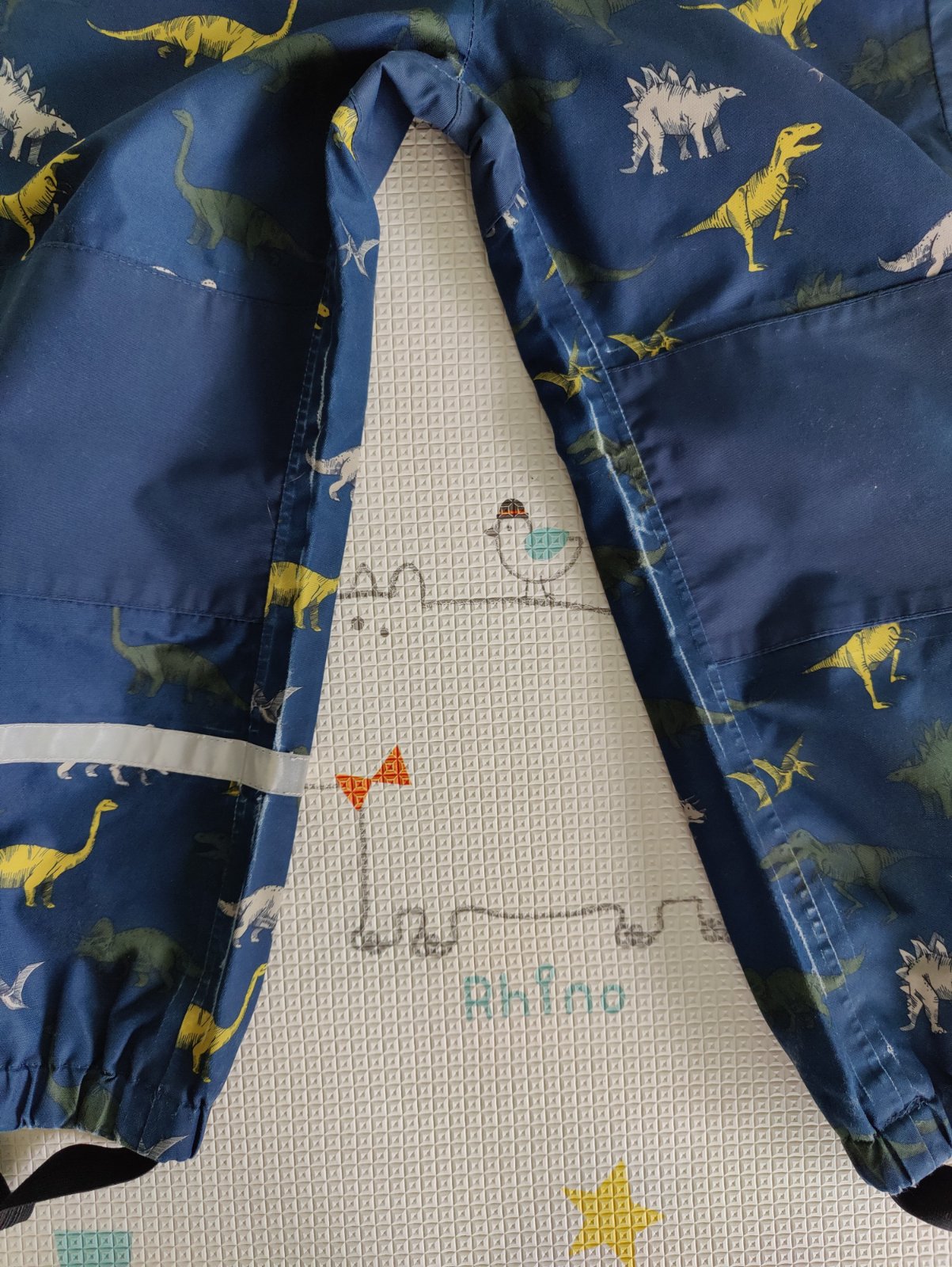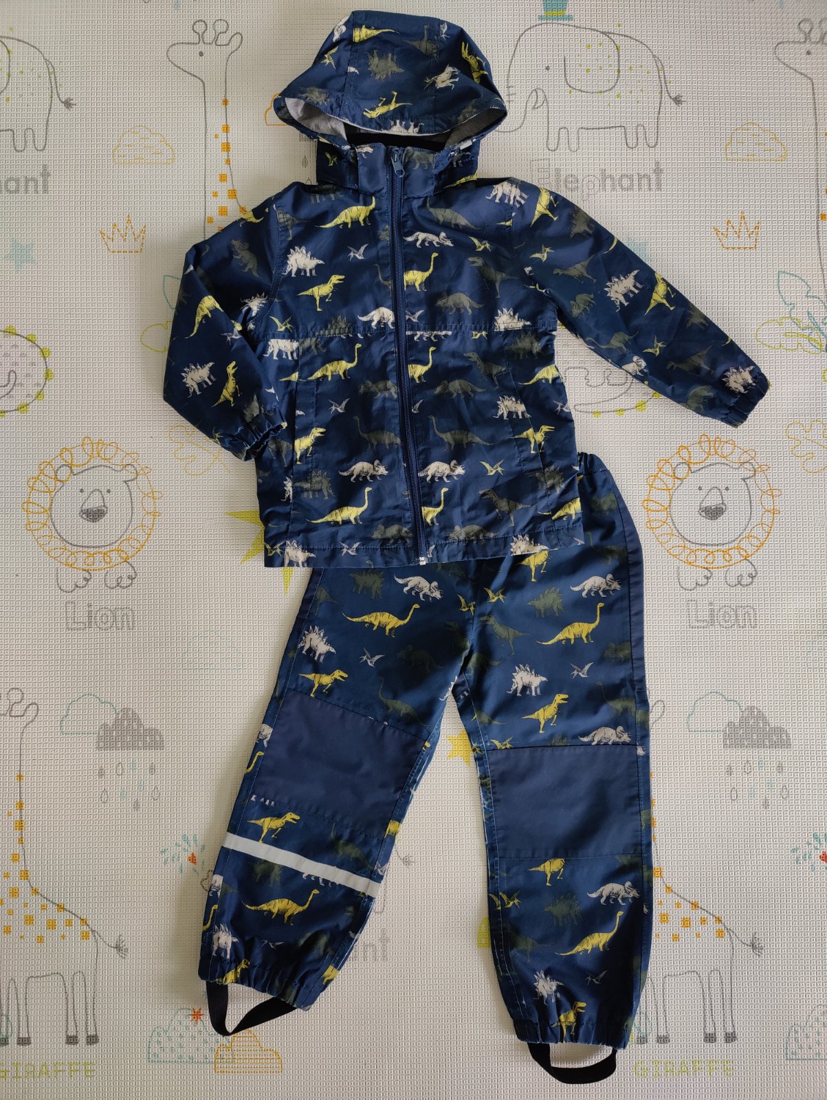 Predám chlapčenskú prechodnú súpravu s motívom dino vhodnú do daždivého a veterného počasia. Značka H&M, veľkosť 116 na cca 5-6 rokov. Farba tmavomodrá v kombinácii so zelenou a sivou. Reflexné prvky. Súprava je z nepremokavého a priedušného funkčného materiálu. Bunda je zateplená fleesom a má odnímateľnú kapucňu. Nohavice majú dvojitú látku v oblasti kolien a zadku. Veľmi pekný nosený stav, akurát na nohaviciach je látka trochu ošúchaná v ohybe na vnútornej strane - vidno na foto.