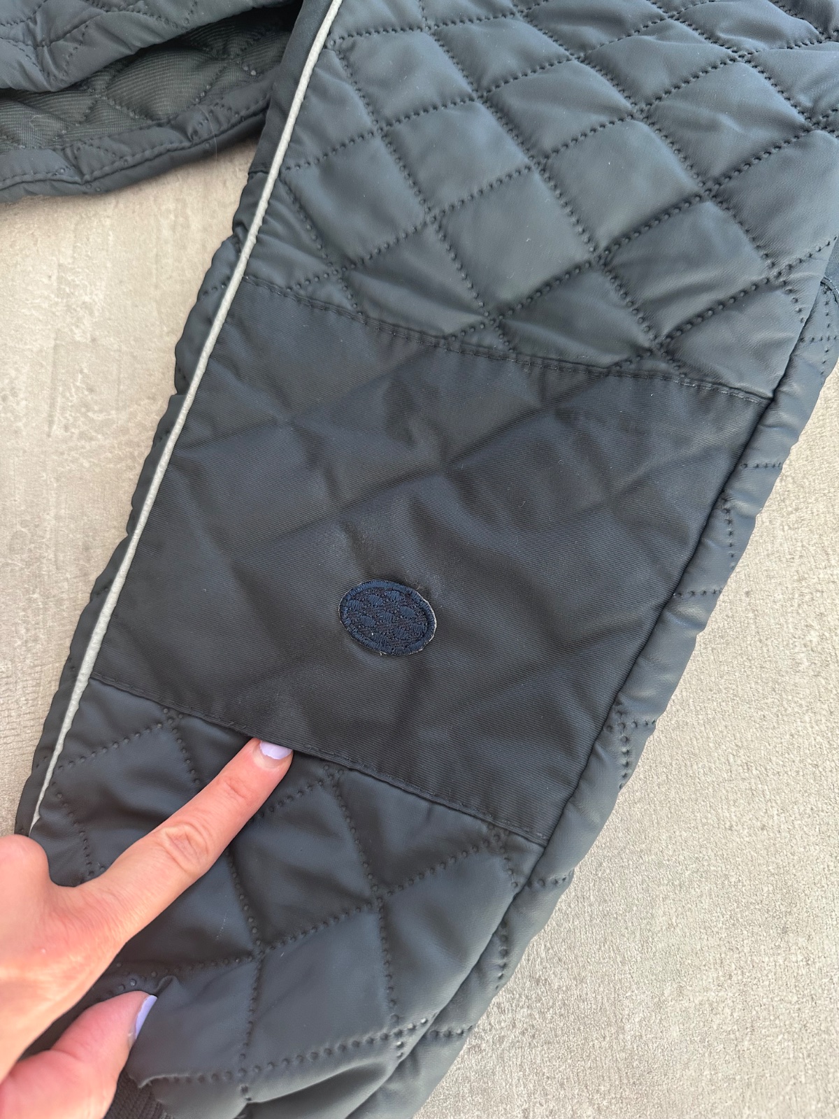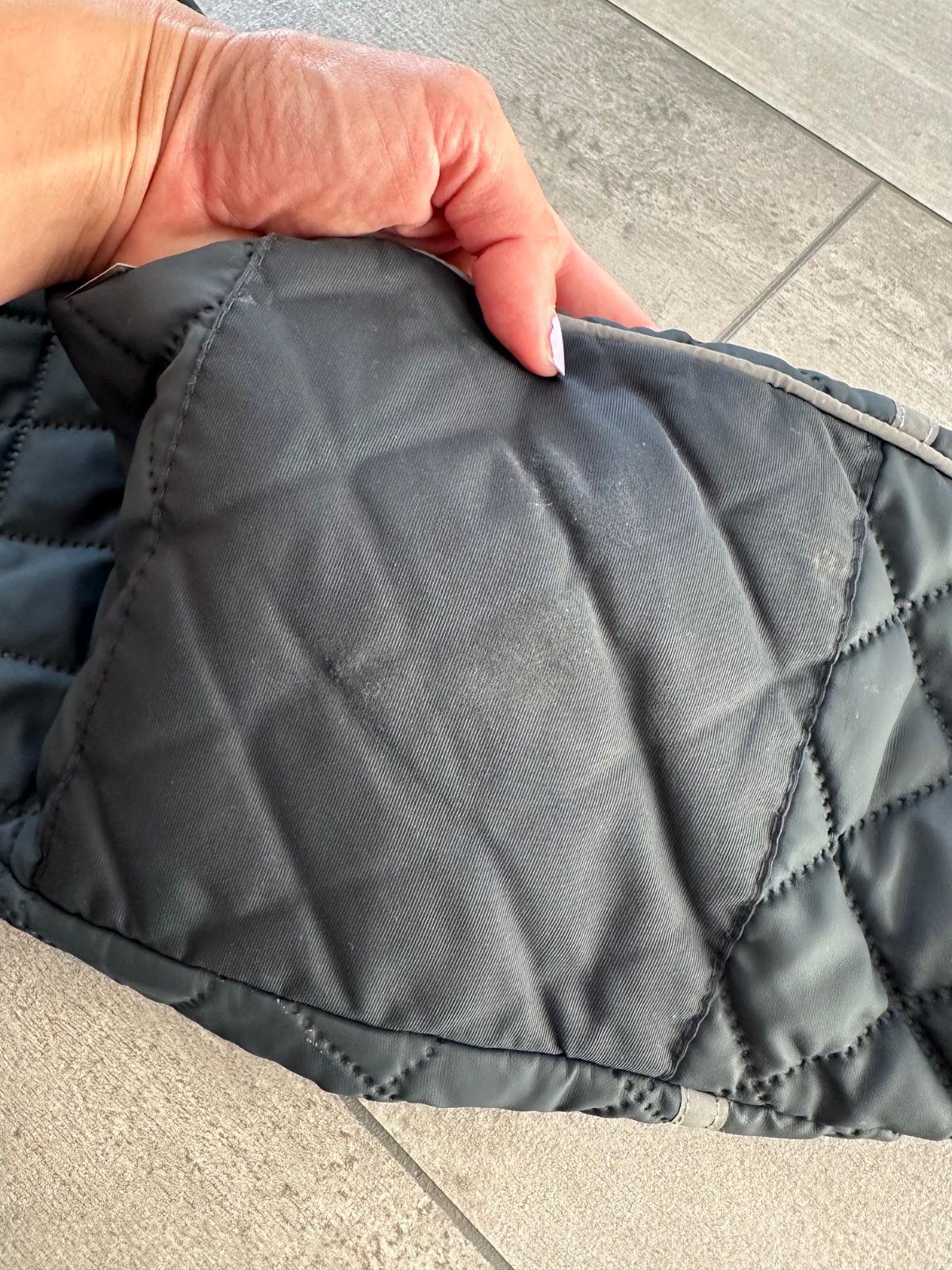 Bunda nebola nosená vôbec. Vodeodolná a vetruvzdorná. Regulácia v páse. Nohavice nosené, našila som tam plátku a na vrchnej vrstve sa trocha pare nitka, je to tam kde som dala prst, neovlyvňuje to vodeodolnosť, druhá noha len jemne šuchnutá. V prípade záujmu premerám, sedí na 98. Cena je pevná.