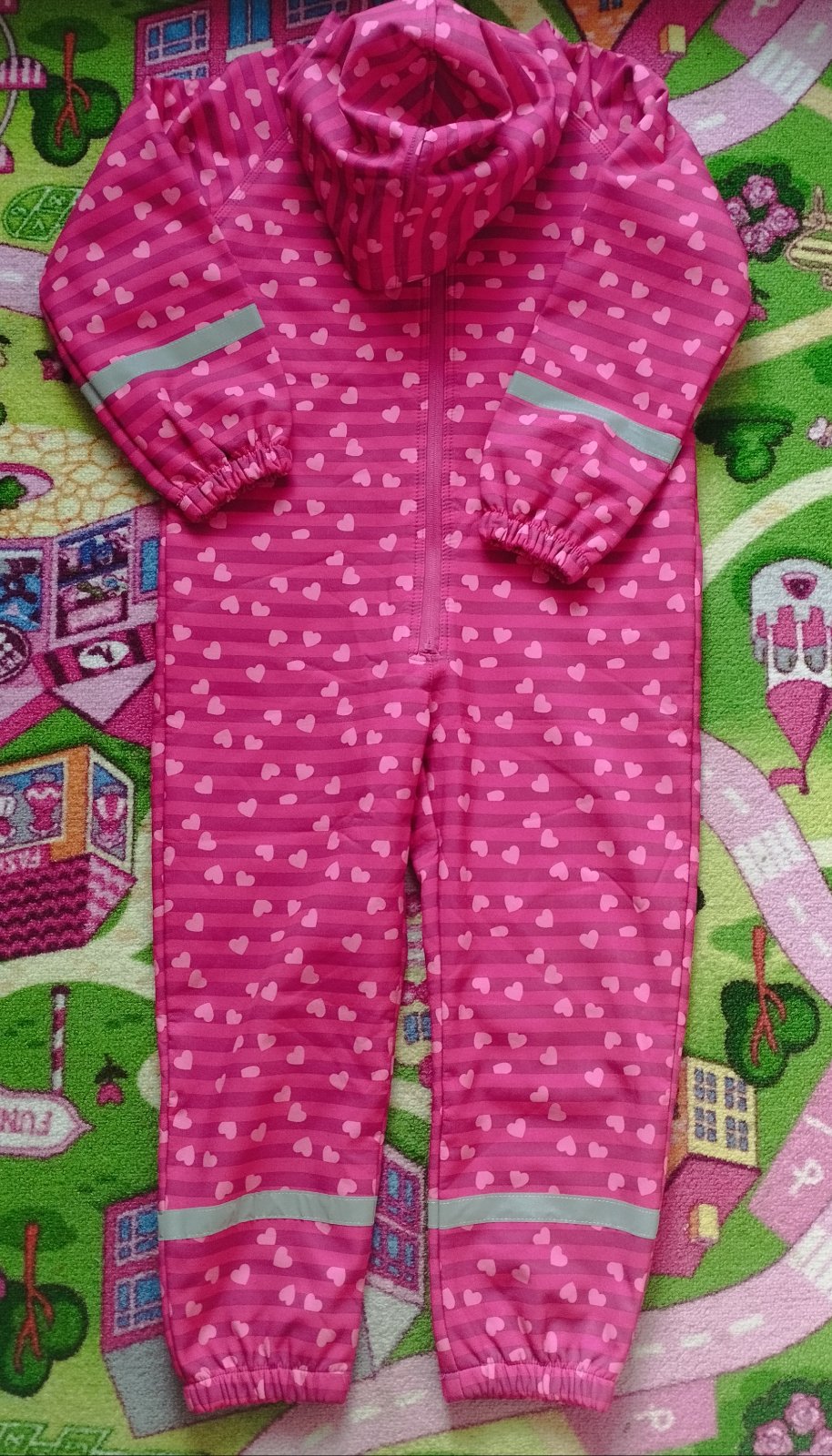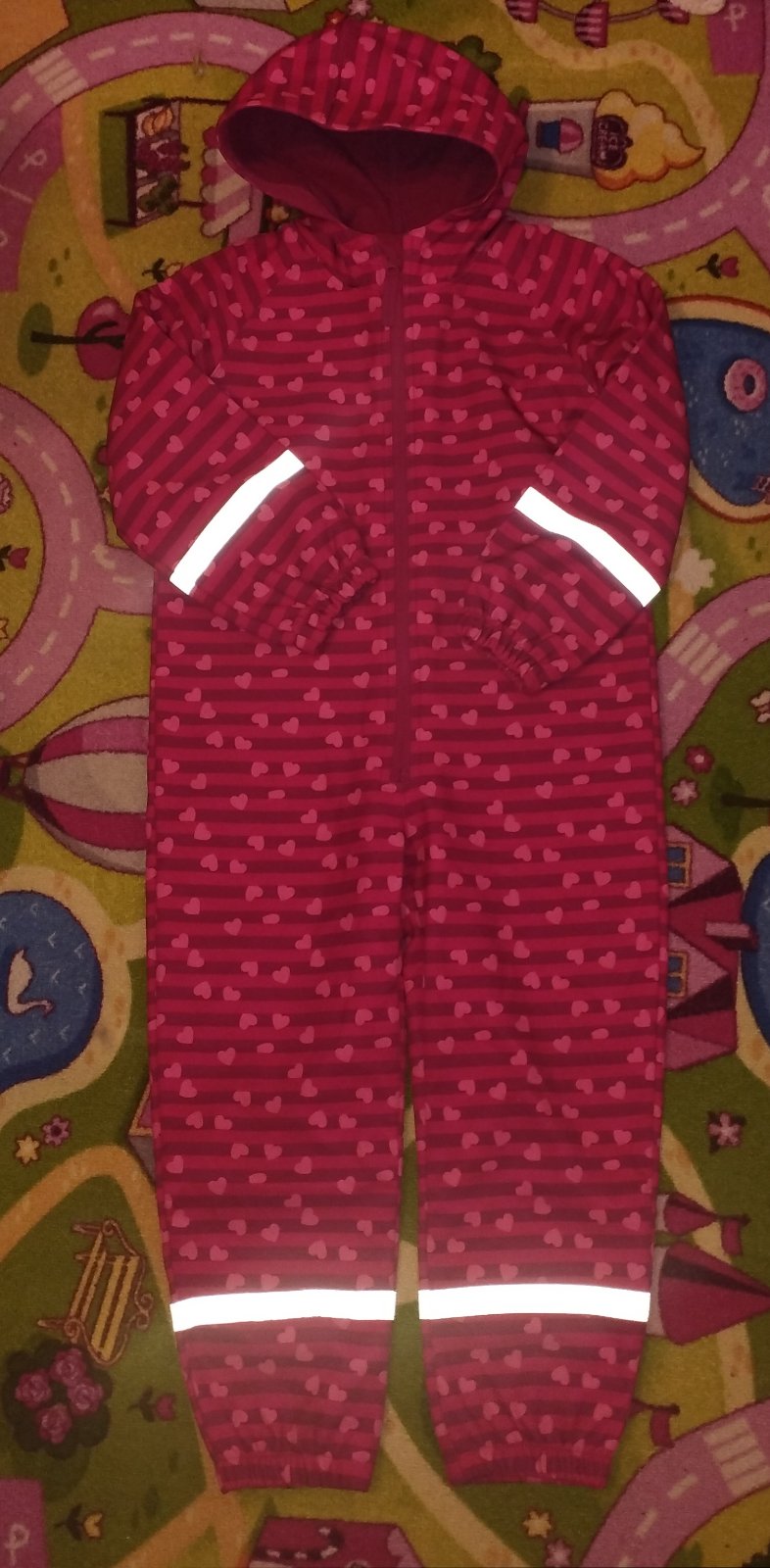Krásny srdiečkový zateplený softshellový overal veľkosť 116/122 ale je väčší tak kľudne aj do 128, v peknom používanom stave