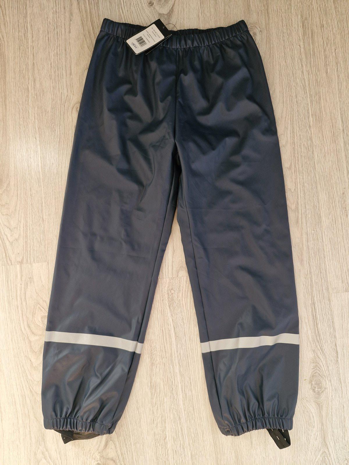 Super praktické nohavice do dažďa, velkost 134/140. Dole našité gumičky aby sa dalu natiahnuť sj cez topánky. Vo veľmi dobrom stave, bez poškodení.