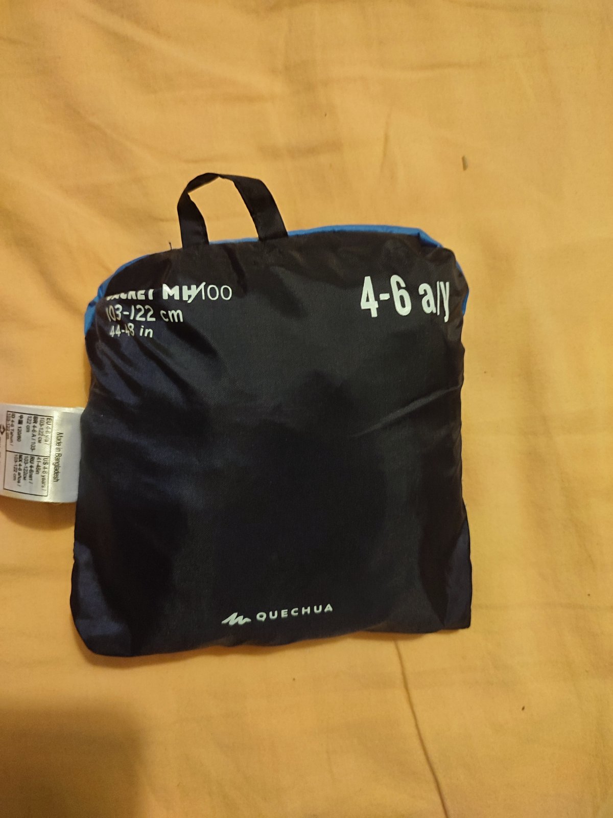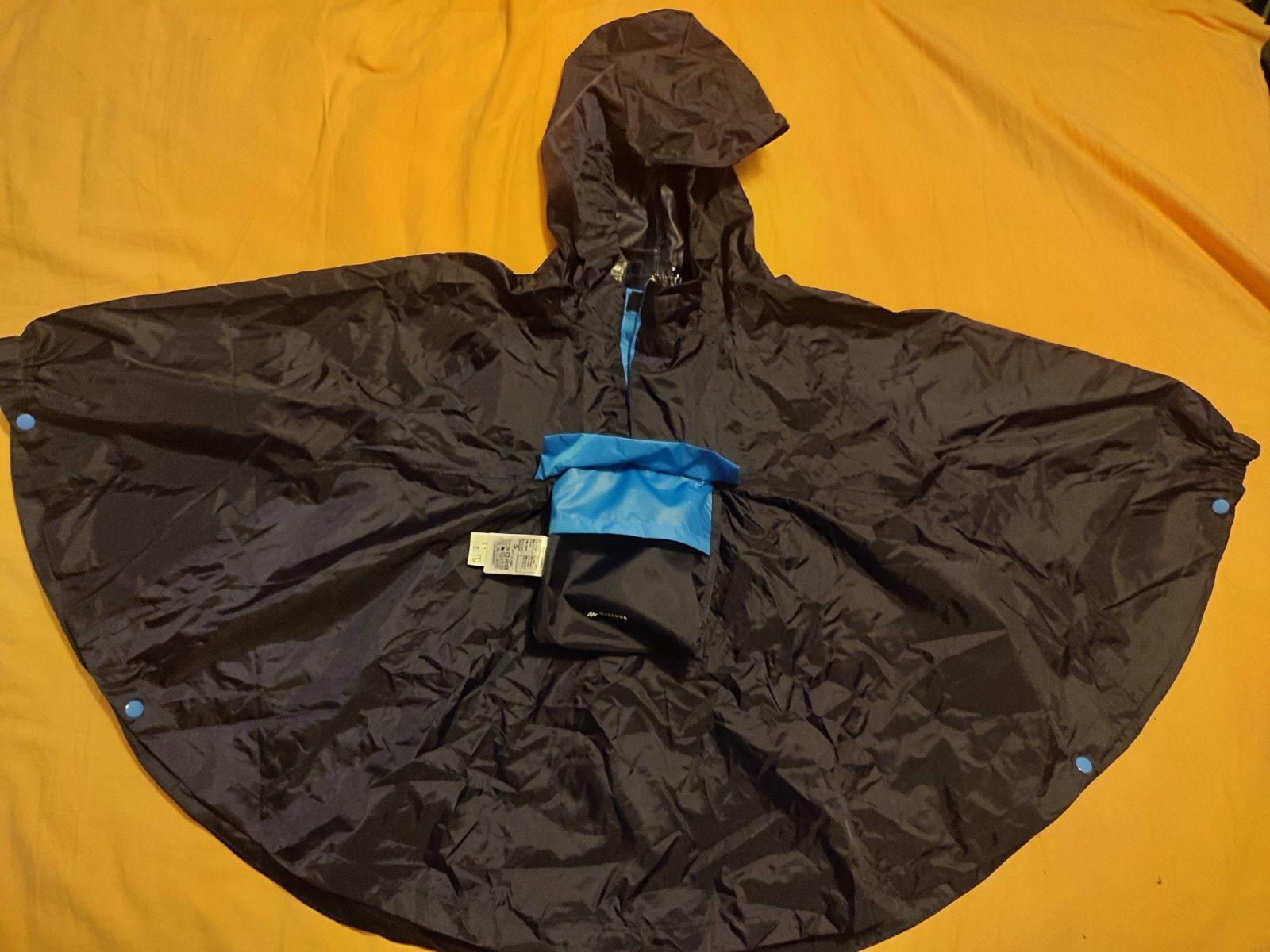 Máličko používaný, syn ho mal v škôlke v skrinke pre prípad dažďa. Dá sa zložiť do vrecka, ktoré je na hrudi. V poskladanom stave má vrecúško s plášťom veľkosť cca 15x15 cm. Pod pončo sa zmestí aj malý ruksak.