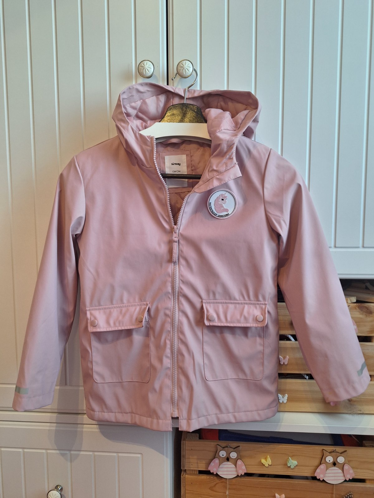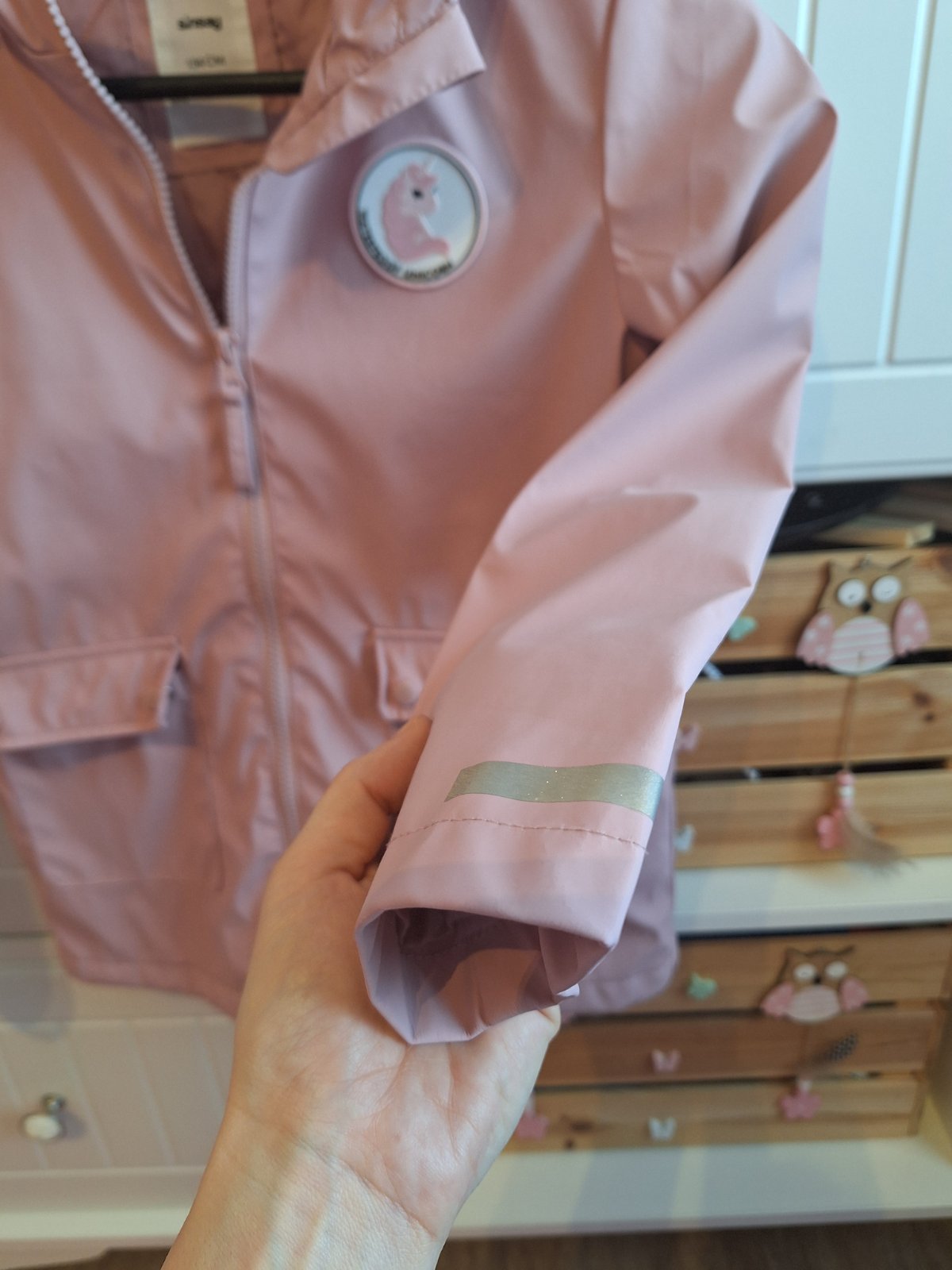 Krásny pršiplášť s obrázkami. Pár krát oblečený,no i tak na 2 miestach akoby zatrhnutý. Nie sú tam dierky,len tá guma sa tak nadvihla,natiahla. Viď foto. Sem tam zafúľaný,nejde z tej gumy dole. Obr...